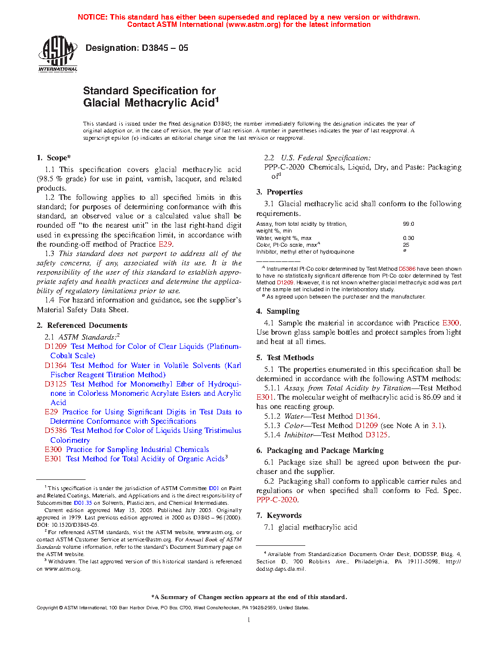 This specification establishes the properties and requirements for glacial methacrylic acid for use in paint, varnish, lacquer, and related products. Specimens shall be appropriately sampled and tested, and shall adhere to specified requirements as to assay from total acidity by titration, weight, weight of water, color (Pt-Co scale), and inhibitor (methyl of hydroquinone).