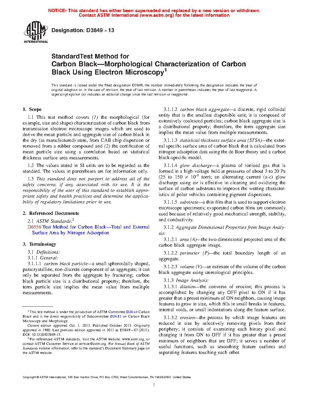 1.1 This test method covers (1) the morphological (for example, size and shape) characterization of carbon black from transmission electron microscope images which are used to derive the mean particle and aggregate size of carbon black in the dry (as manufactured) state, from CAB chip dispersion or removed from a rubber compound and (2) the certification of mean particle size using a correlation based on statistical thickness surface area measurements.