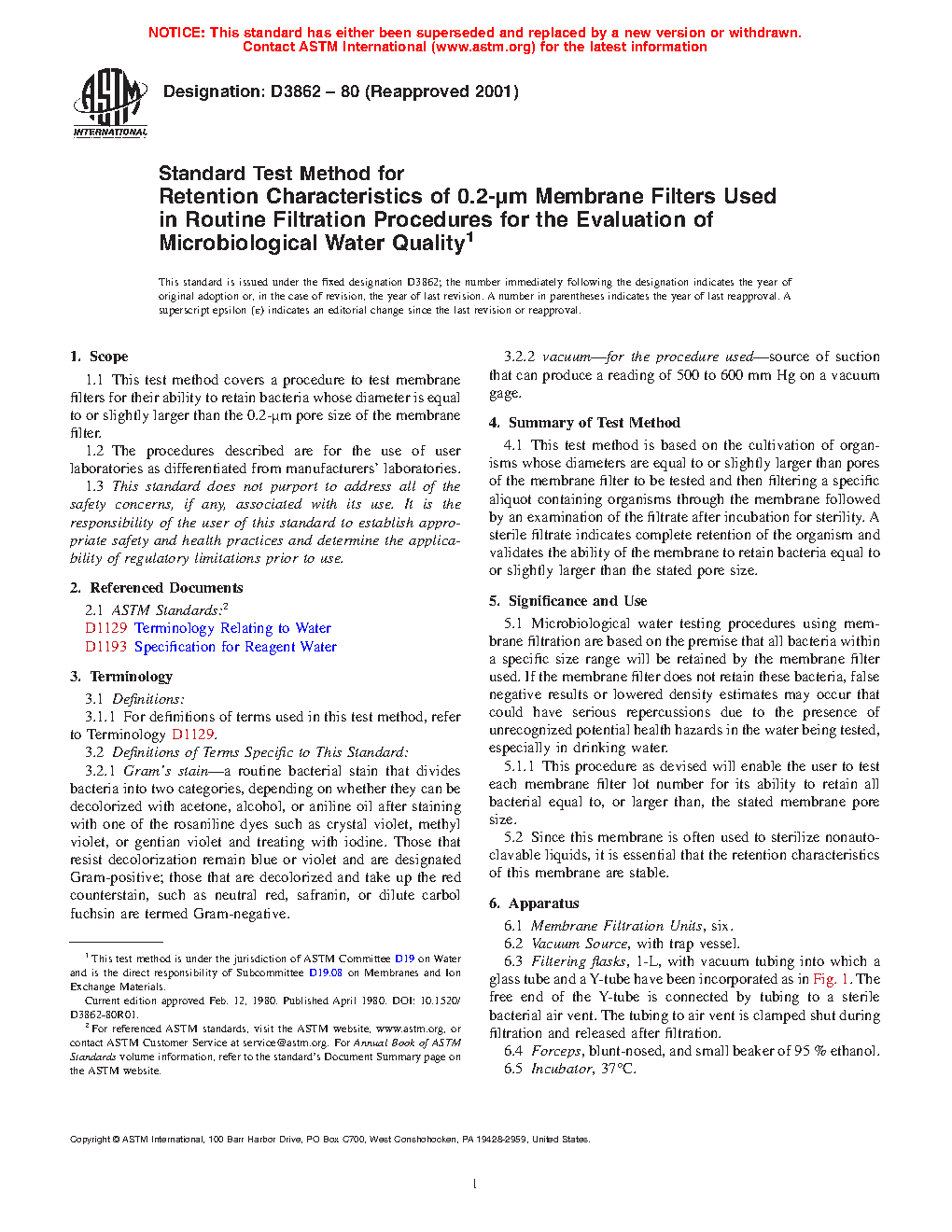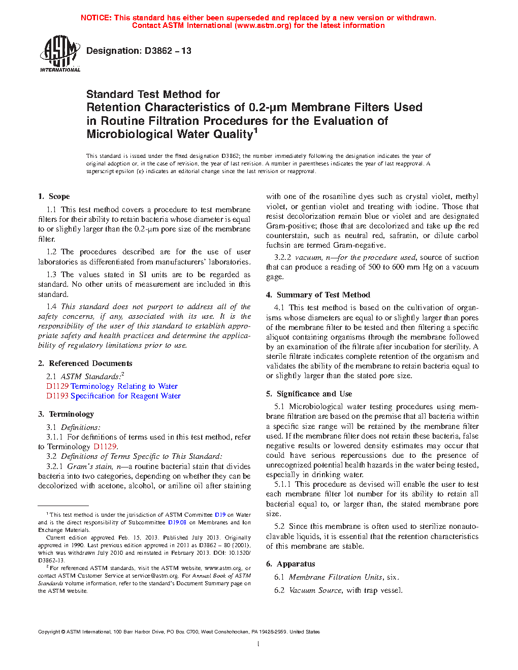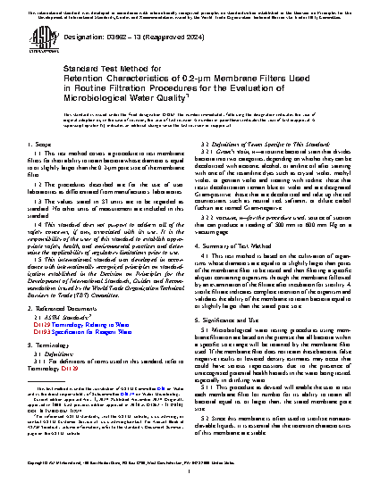 1.1 This test method covers a procedure to test membrane filters for their ability to retain bacteria whose diameter is equal to or slightly larger than the 0.2-µm pore size of the membrane filter.