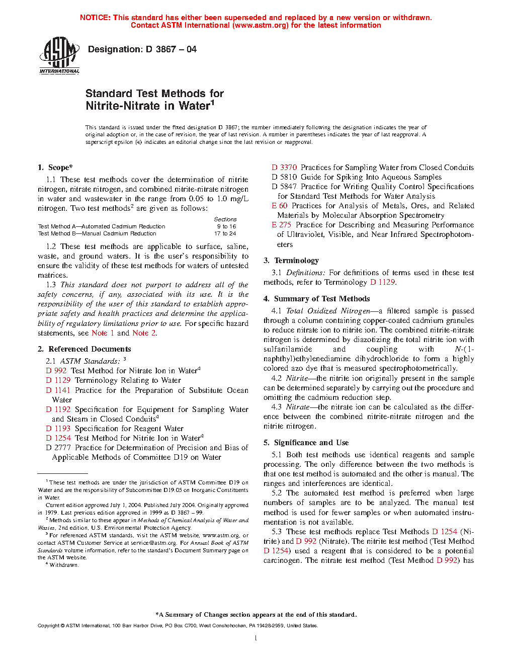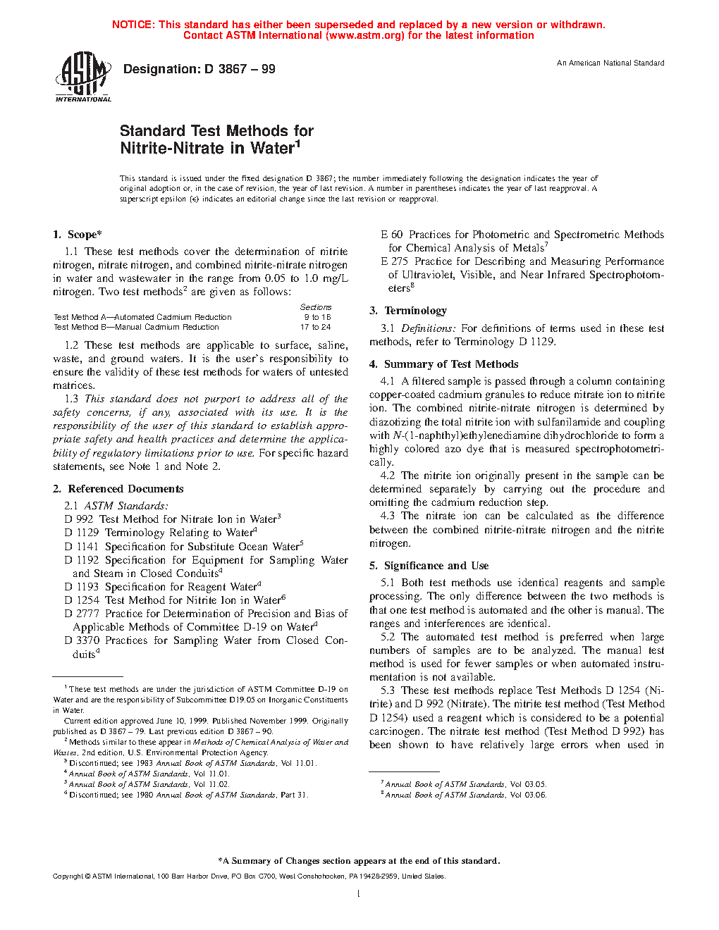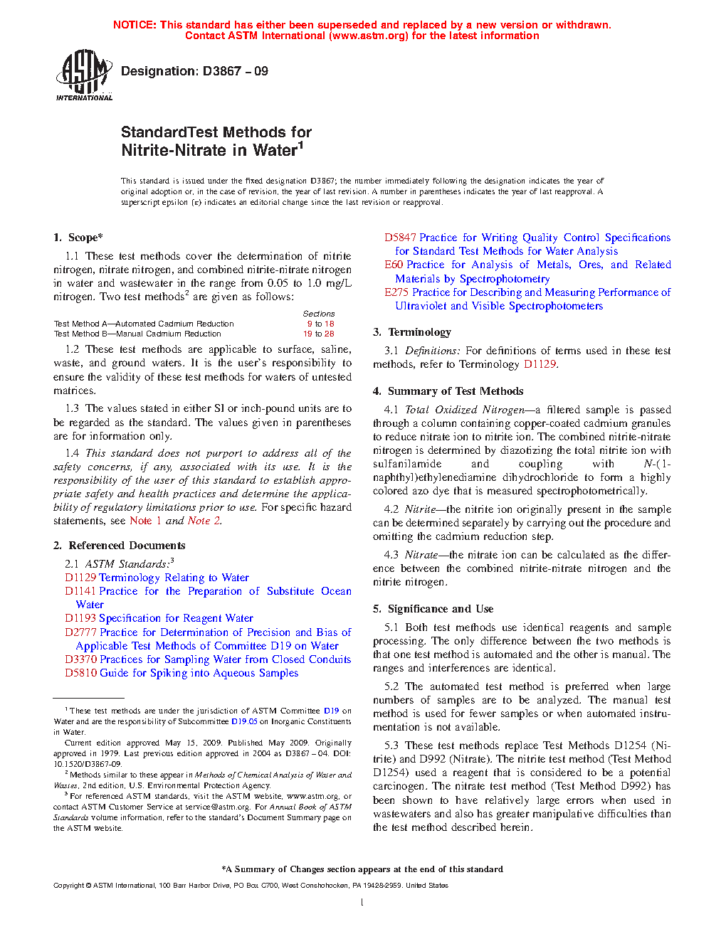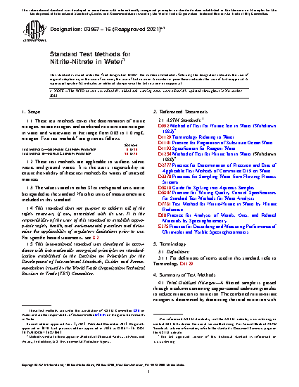 1.1 These test methods cover the determination of nitrite nitrogen, nitrate nitrogen, and combined nitrite-nitrate nitrogen in water and wastewater in the range from 0.05 to 1.0 mg/L nitrogen. Two test methods are given as follows: