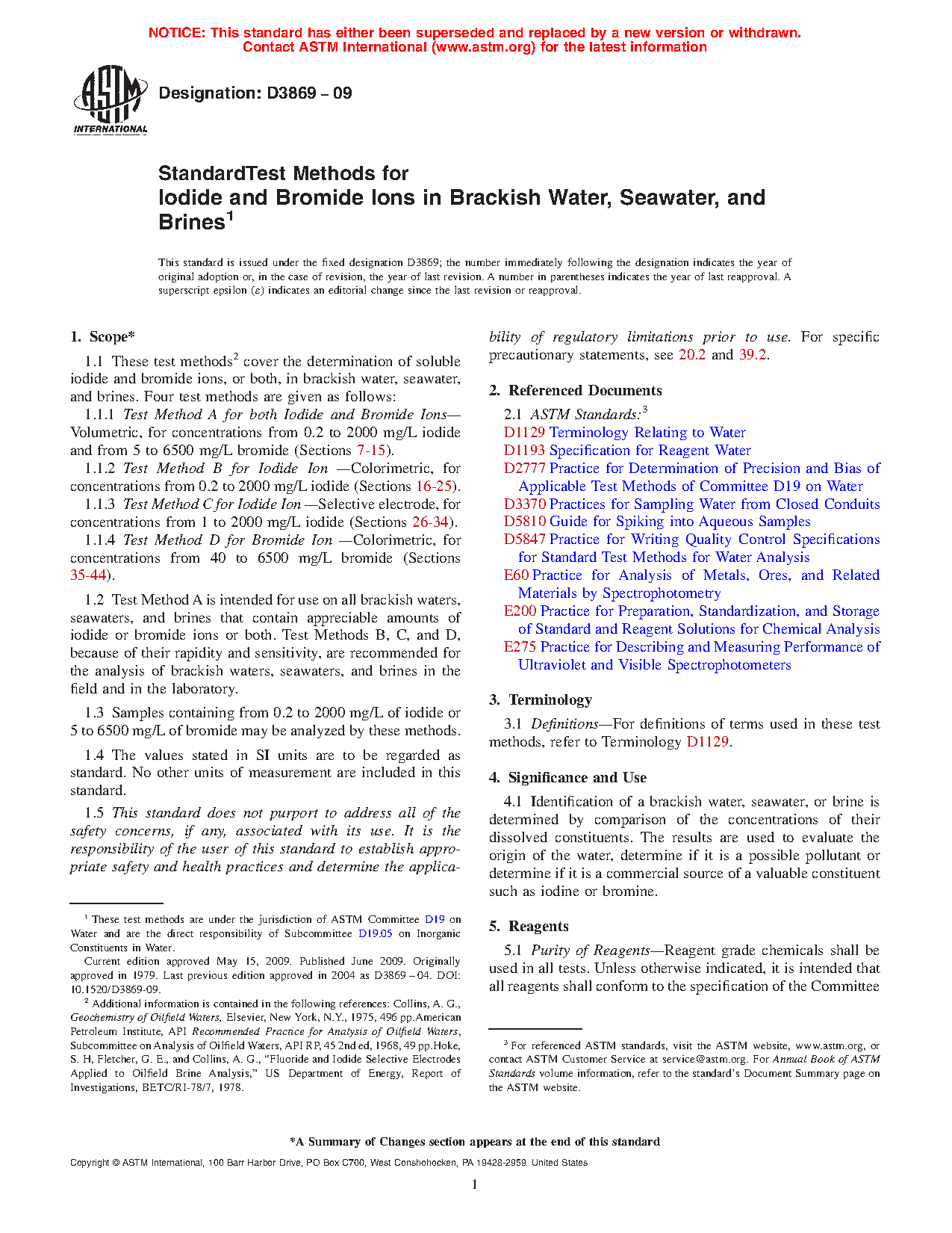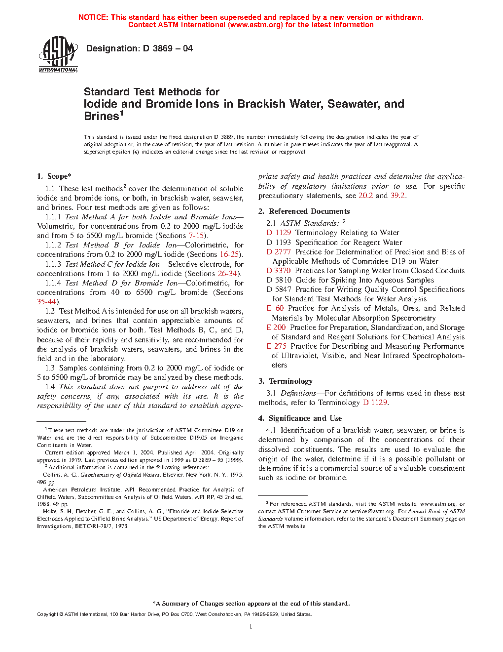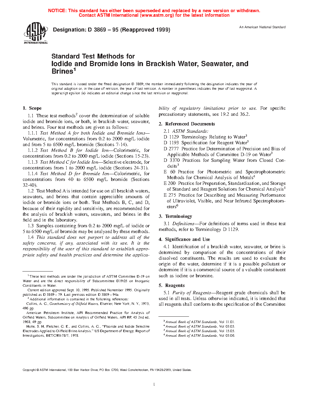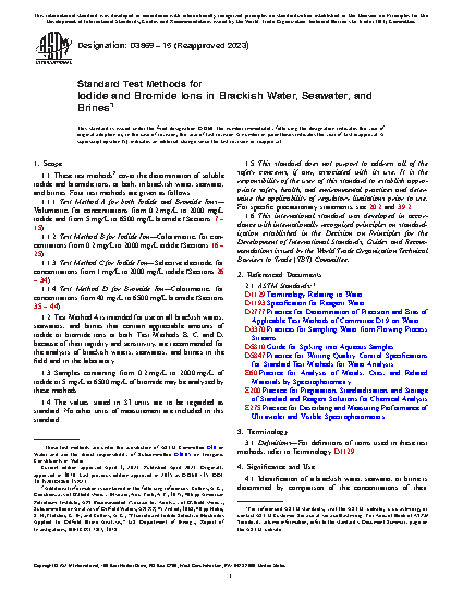 1.1 These test methods2 cover the determination of soluble iodide and bromide ions, or both, in brackish water, seawater, and brines. Four test methods are given as follows: