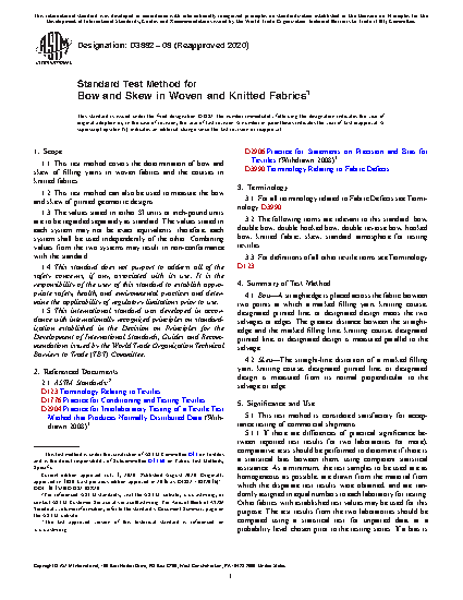 1.1 This test method covers the determination of bow and skew of filling yarns in woven fabrics and the courses in knitted fabrics.