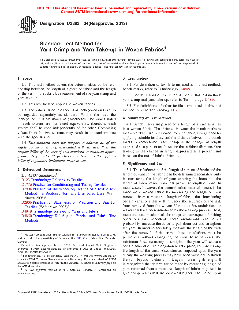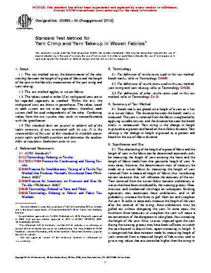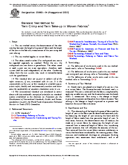 1.1 This test method covers the determination of the relationship between the length of a piece of fabric and the length of the yarn in the fabric by measurement of the yarn crimp and yarn take-up.