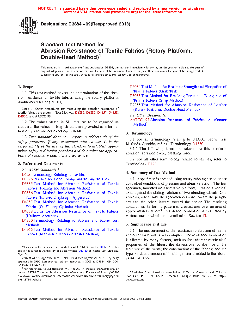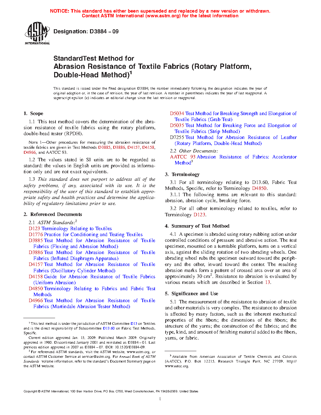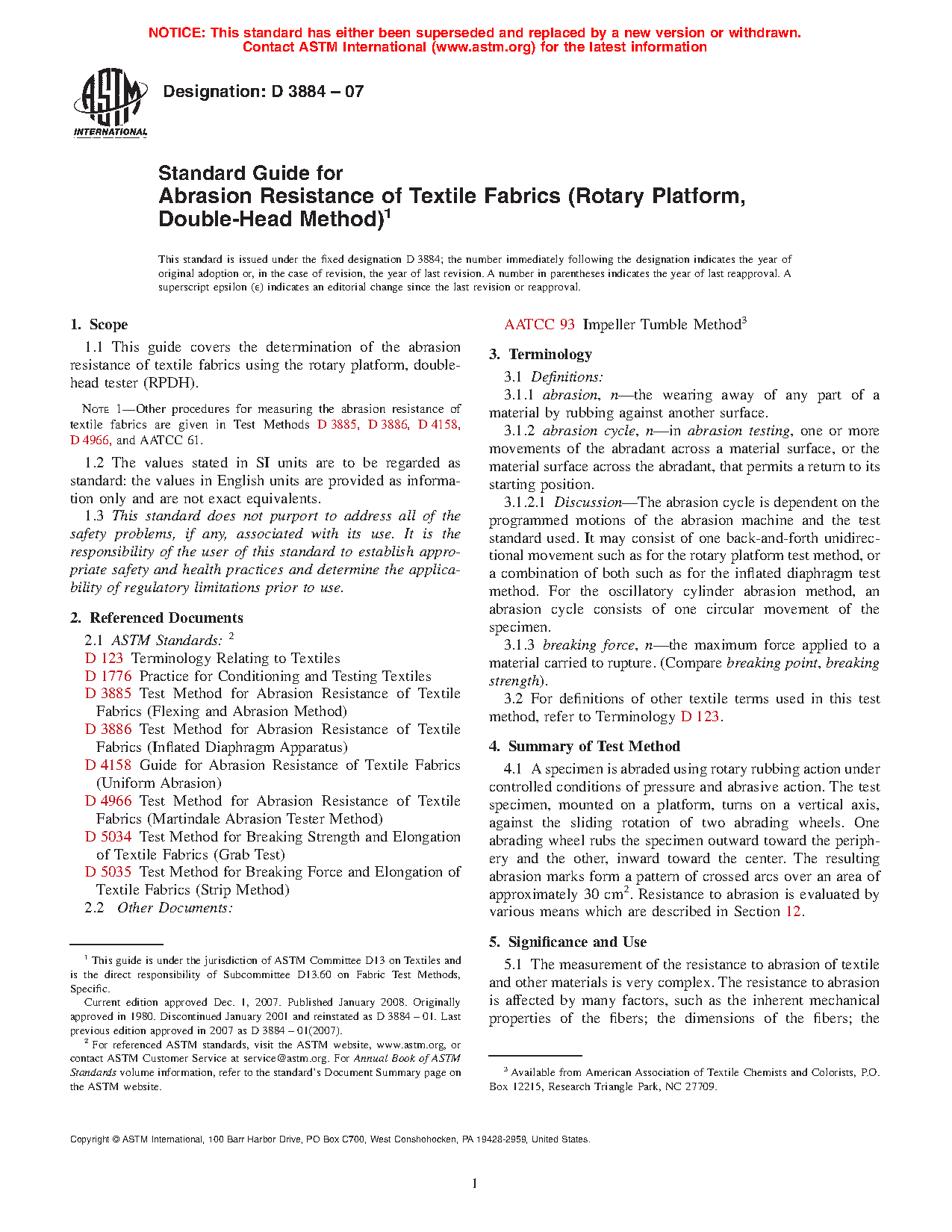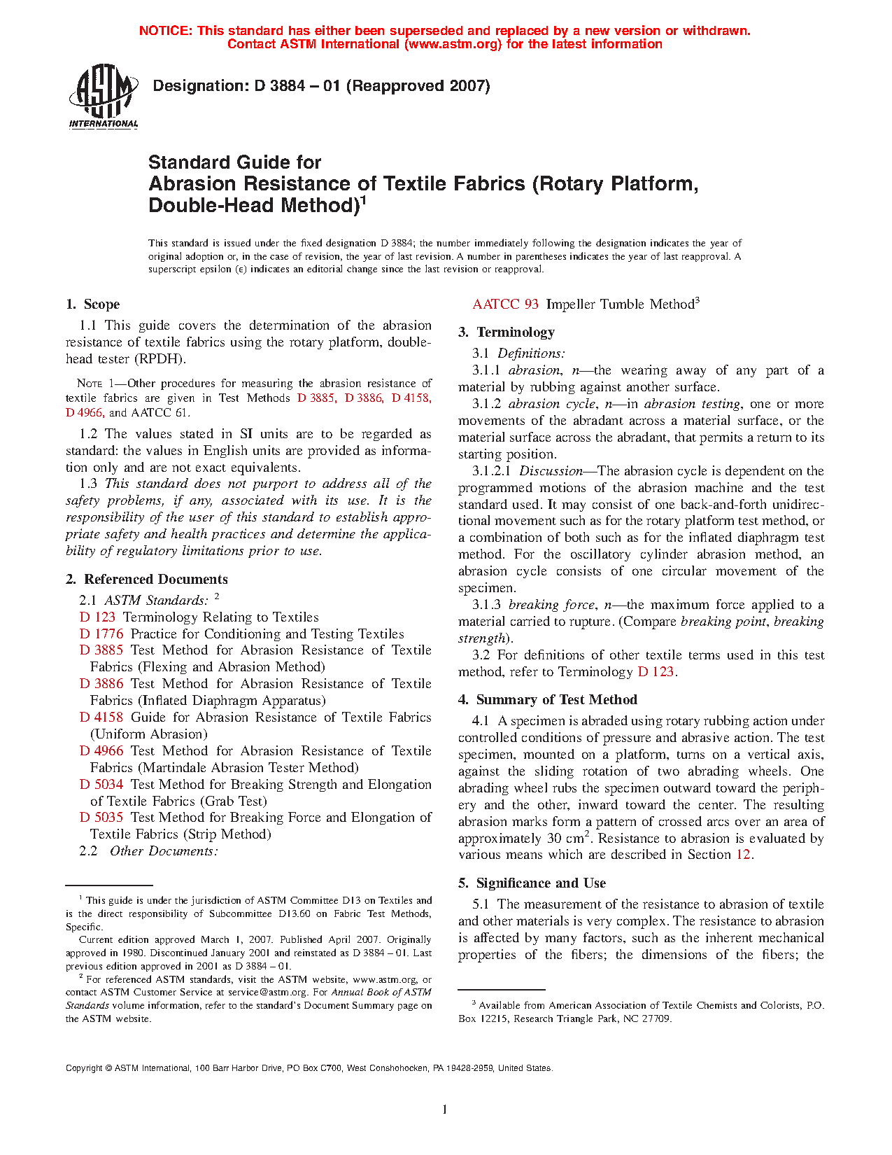 Note 1: Other procedures for measuring the abrasion resistance of textile fabrics are given in Test Methods D3389, D3885, D3886, D4157, D4158, D4685, D4966, and AATCC 93. To determine the abrasion resistance of leather, refer to Test Method D7255.