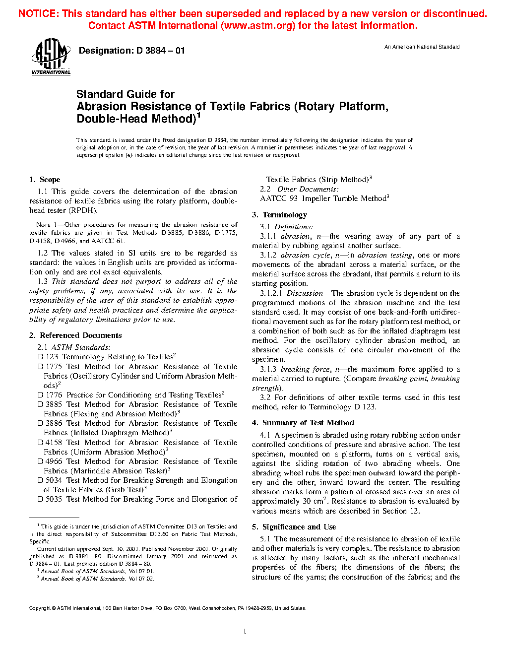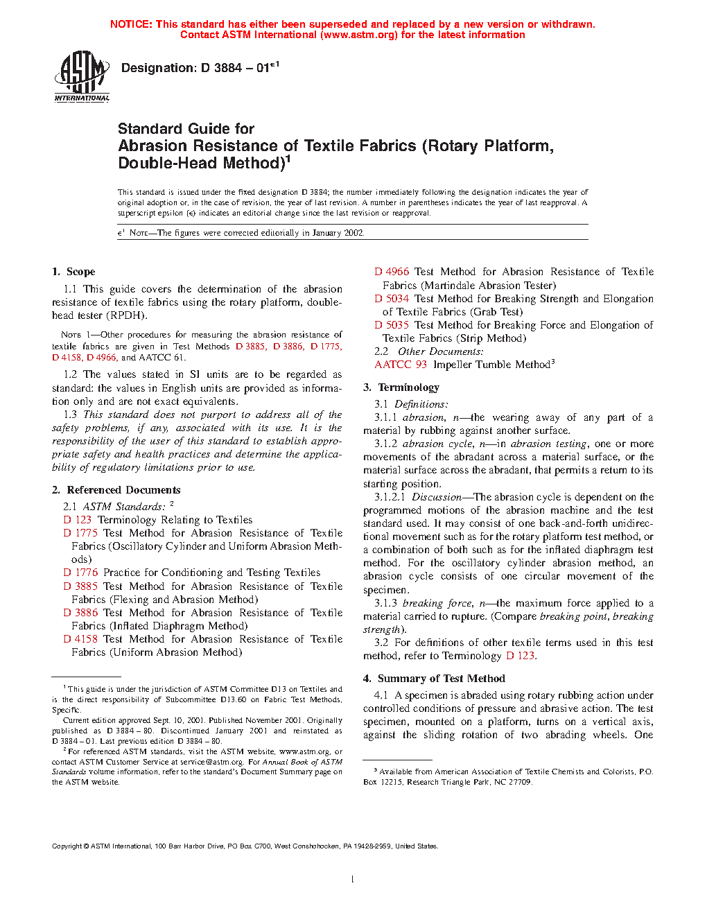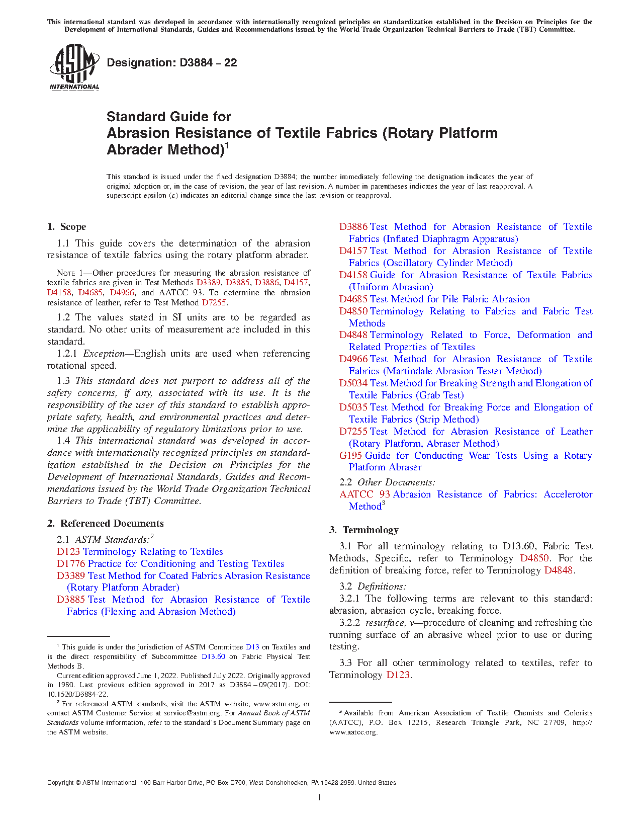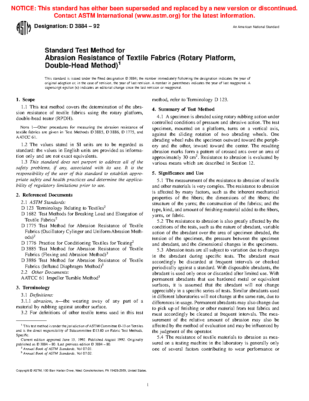Note 1: Other procedures for measuring the abrasion resistance of textile fabrics are given in Test Methods D3389, D3885, D3886, D4157, D4158, D4685, D4966, and AATCC 93. To determine the abrasion resistance of leather, refer to Test Method D7255.