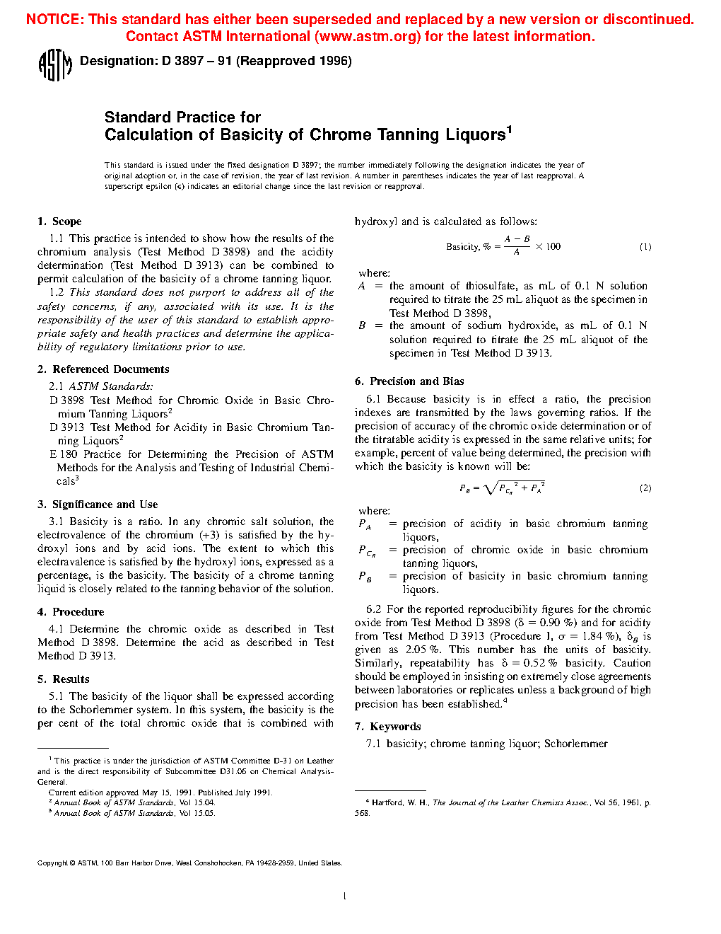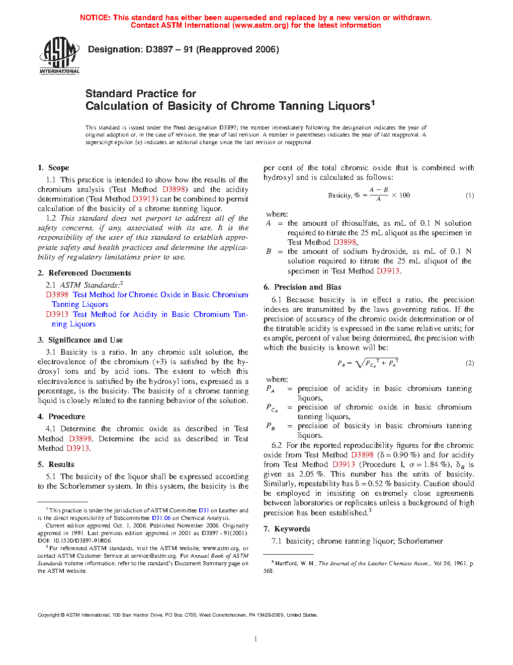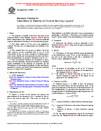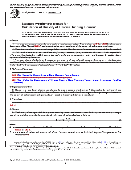 1.1 This test method is intended to show how the results of the chromium analysis (Test Methods D3898 or D6019) and the acidity determination (Test Method D3913) can be combined to permit calculation of the basicity of a chrome tanning liquor.