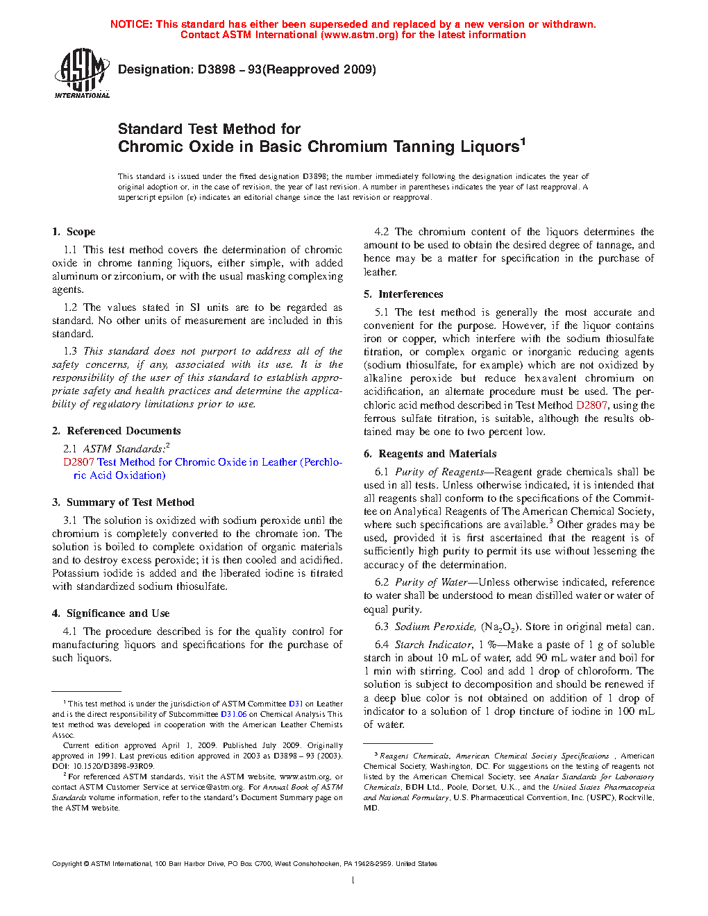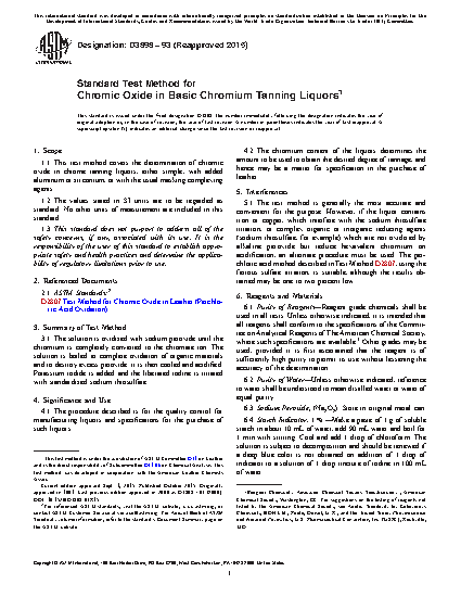 1.1 This test method covers the determination of chromic oxide in chrome tanning liquors, either simple, with added aluminum or zirconium, or with the usual masking complexing agents.