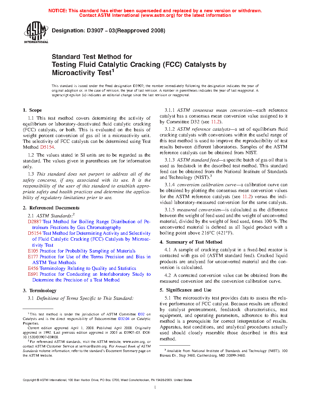 1.1 This test method covers determining the activity of equilibrium or laboratory-deactivated fluid catalytic cracking (FCC) catalysts, or both. This is evaluated on the basis of weight percent conversion of gas oil in a microactivity unit. The selectivity of FCC catalysts can be determined using Test Method D5154.