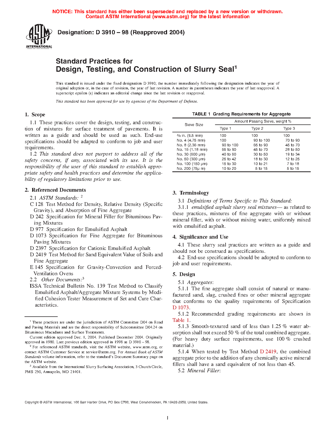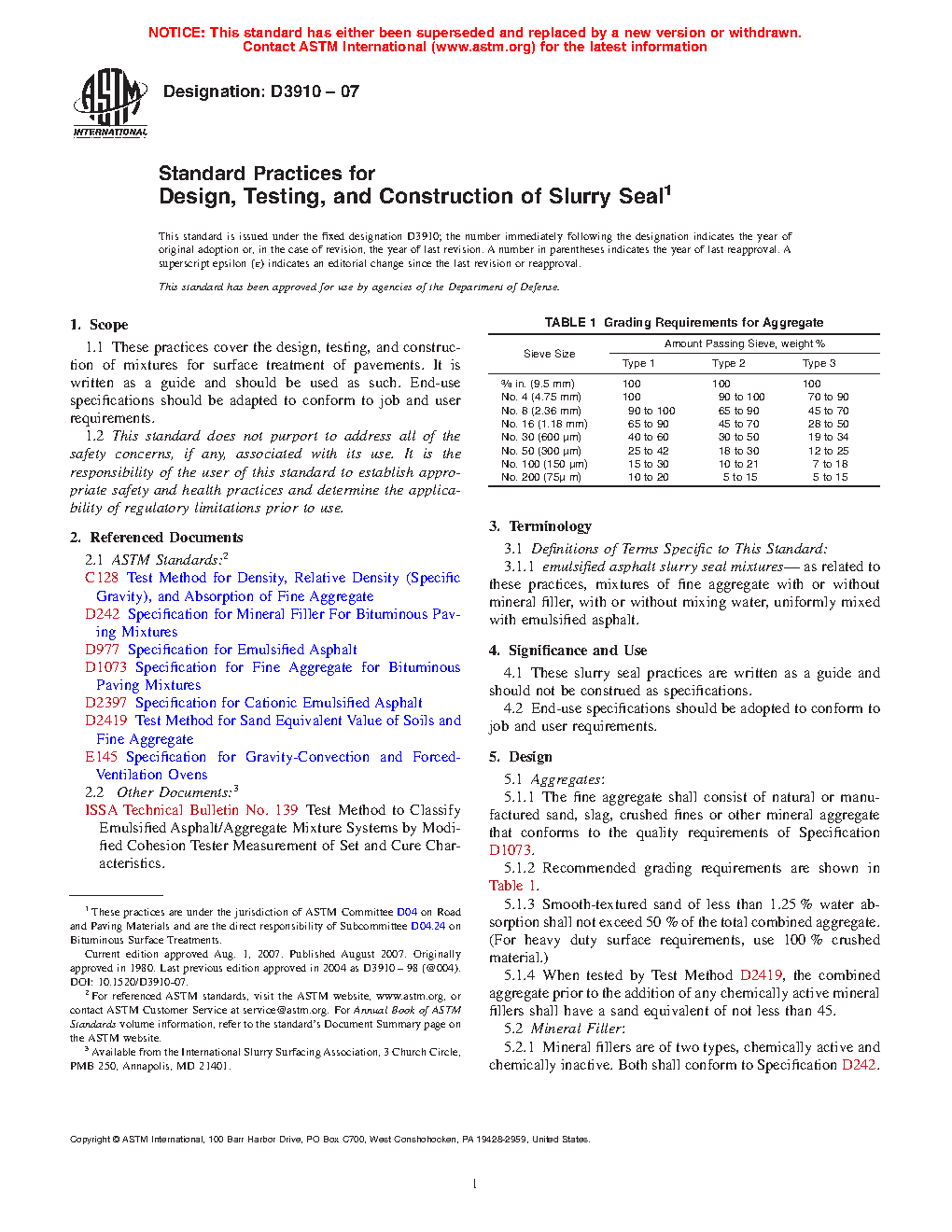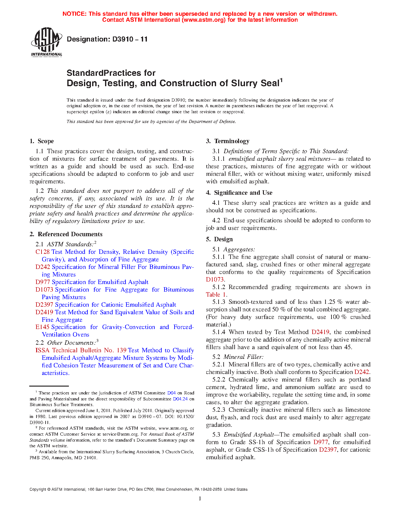 1.1 These practices cover the design, testing, and construction of mixtures for surface treatment of pavements. It is written as a guide and should be used as such. End-use specifications should be adapted to conform to job and user requirements.