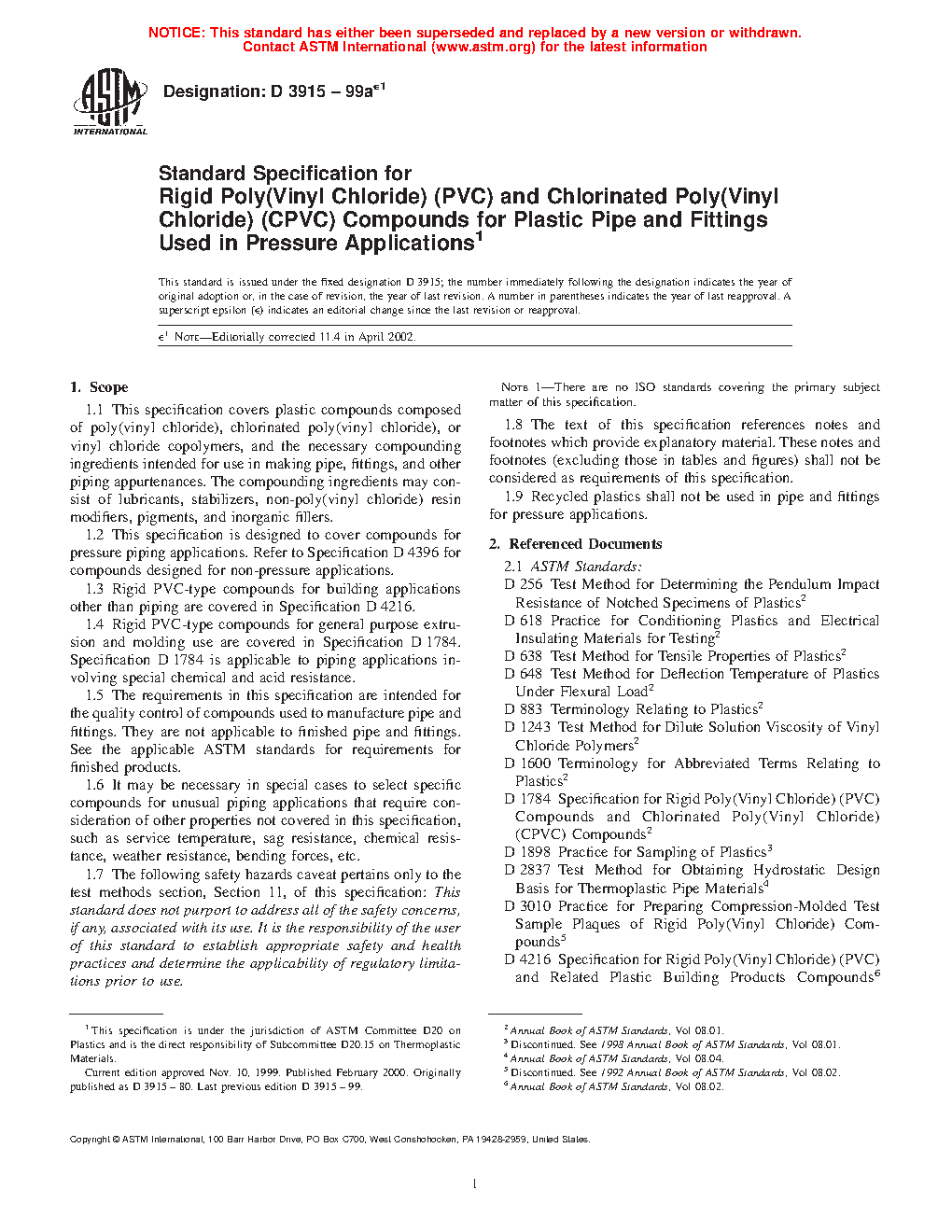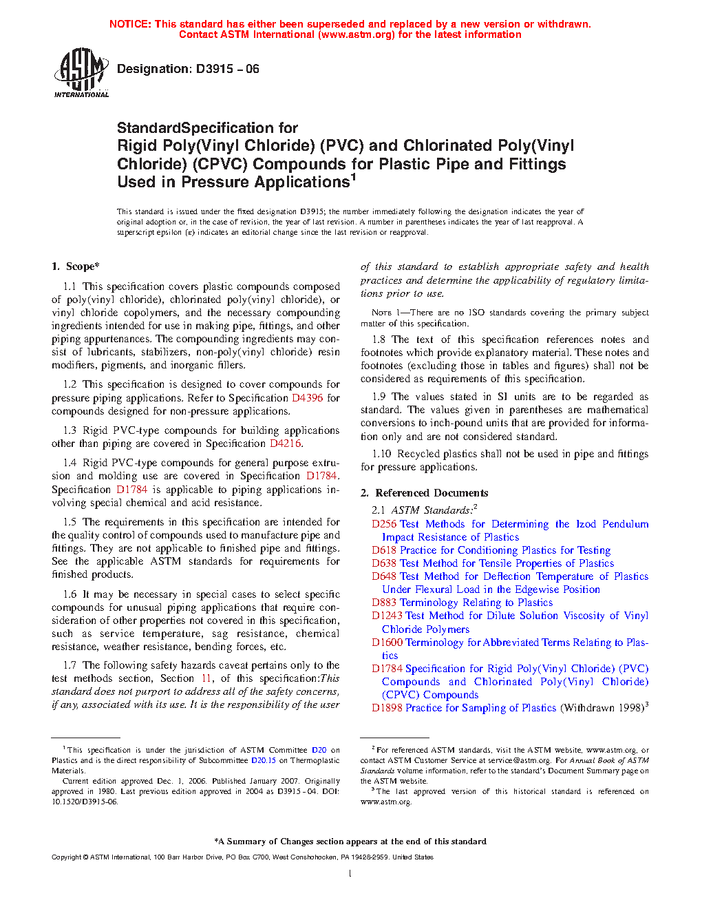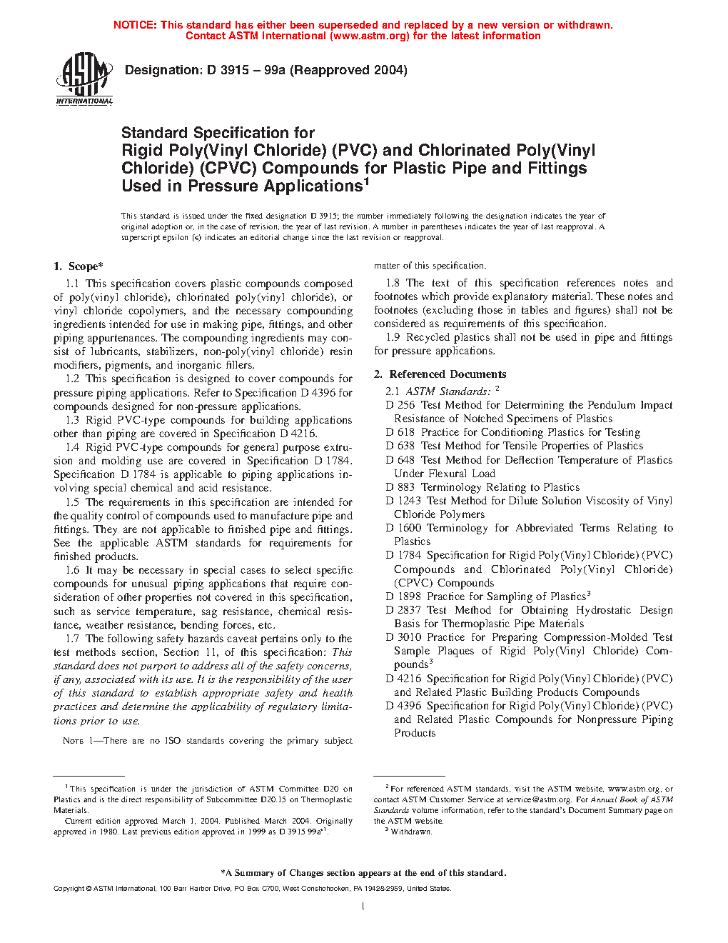 1.4 Rigid PVC-type compounds for general purpose extrusion and molding use are covered in Specification D 1784. Specification D 1784 is applicable to piping applications involving special chemical and acid resistance.