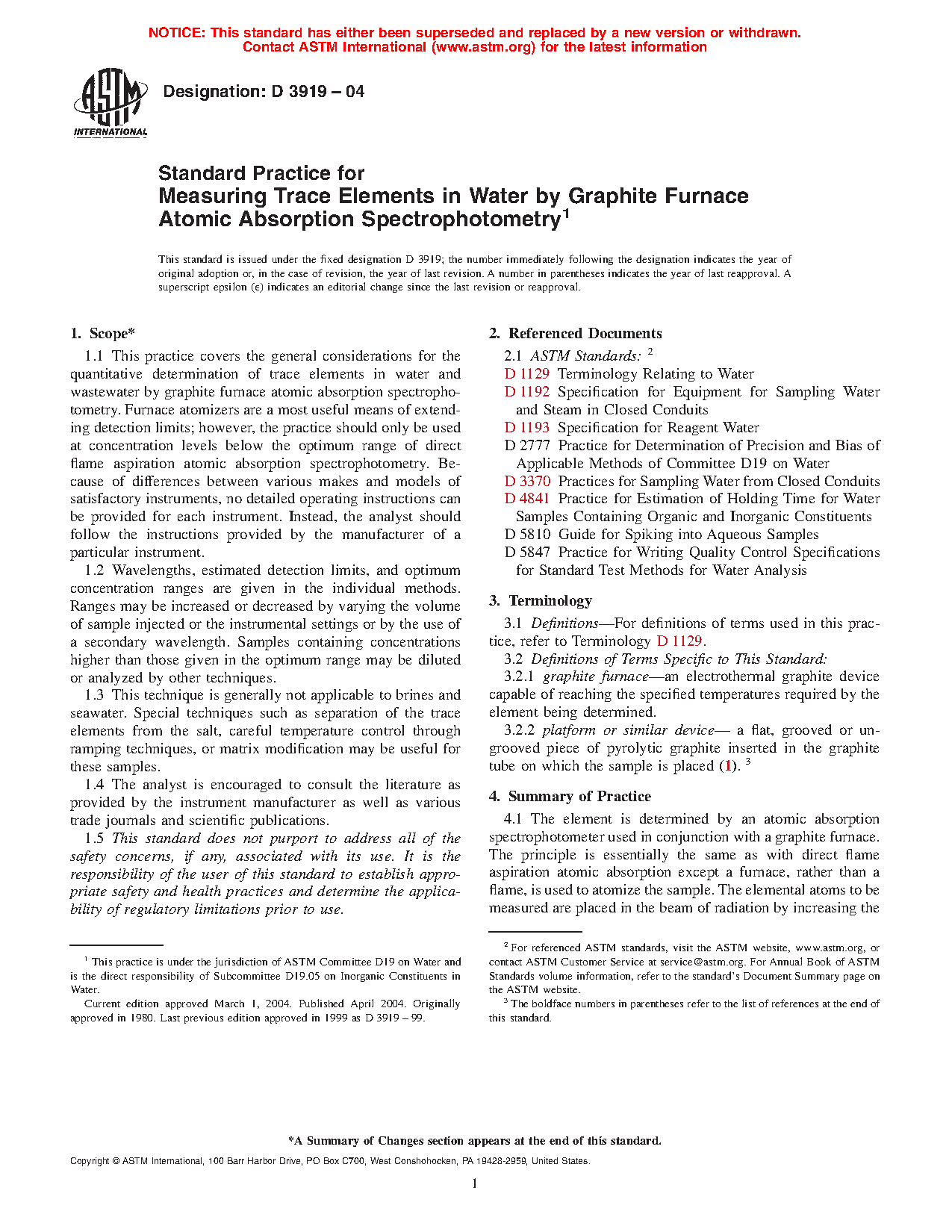 5.1 Elemental constituents in potable water, receiving water, and wastewater need to be identified for support of effective pollution control programs. Currently, one of the most sensitive and practical means for measuring low concentrations of trace elements is by graphite furnace atomic absorption spectrophotometry. ICP-MS may also be appropriate but at a higher instrument cost. See Test Method D5673.
