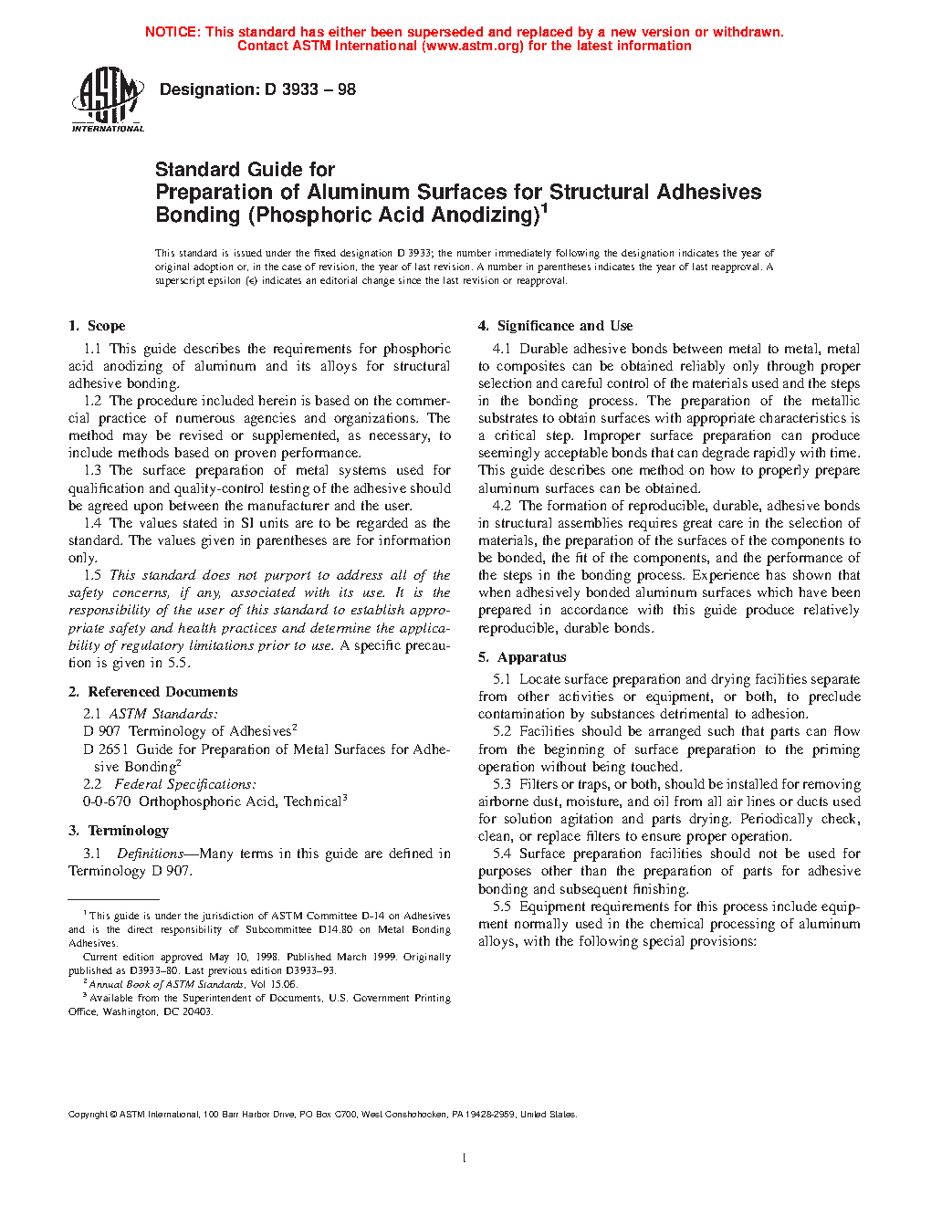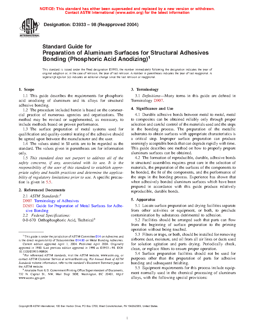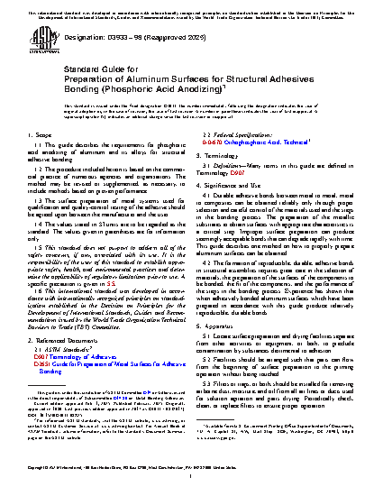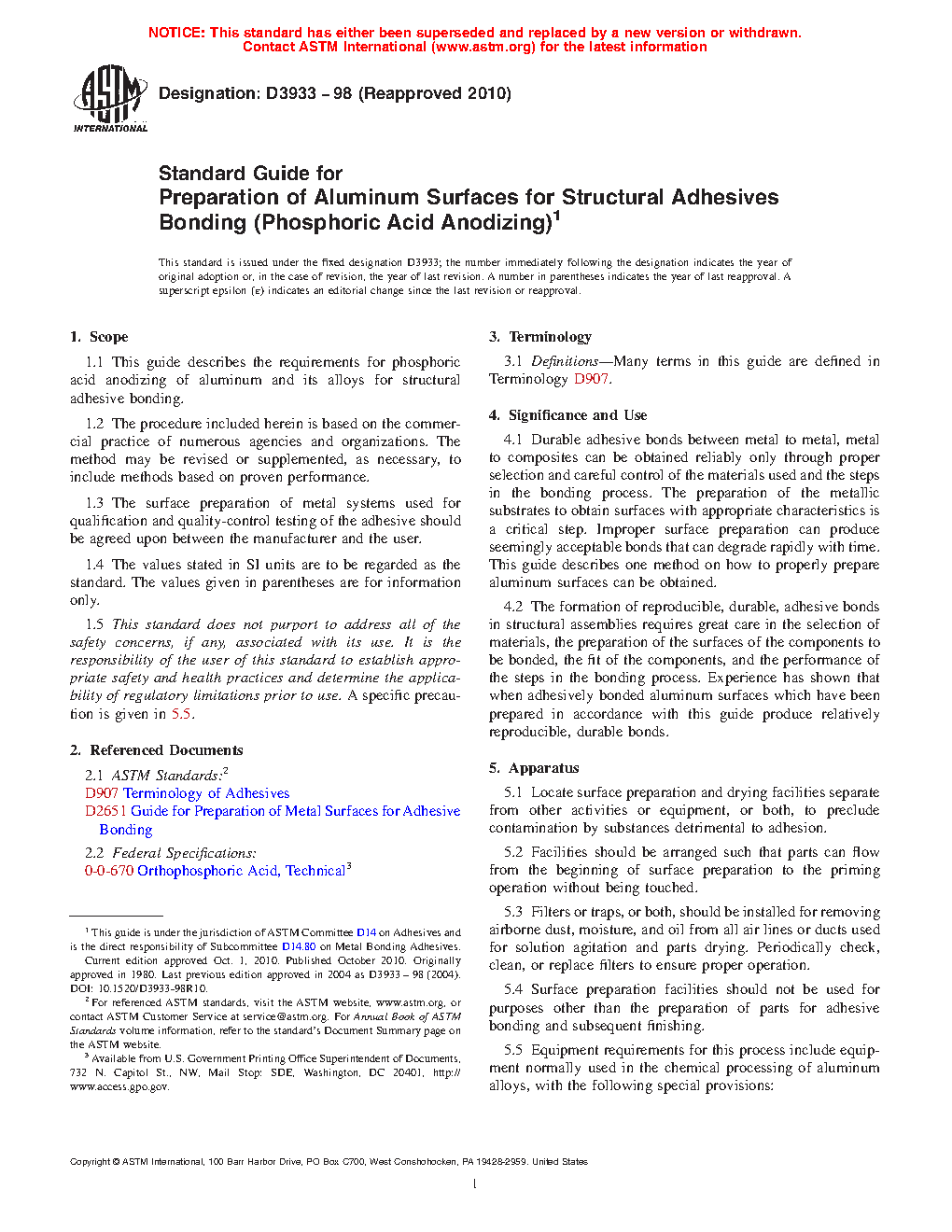 1.1 This guide describes the requirements for phosphoric acid anodizing of aluminum and its alloys for structural adhesive bonding.