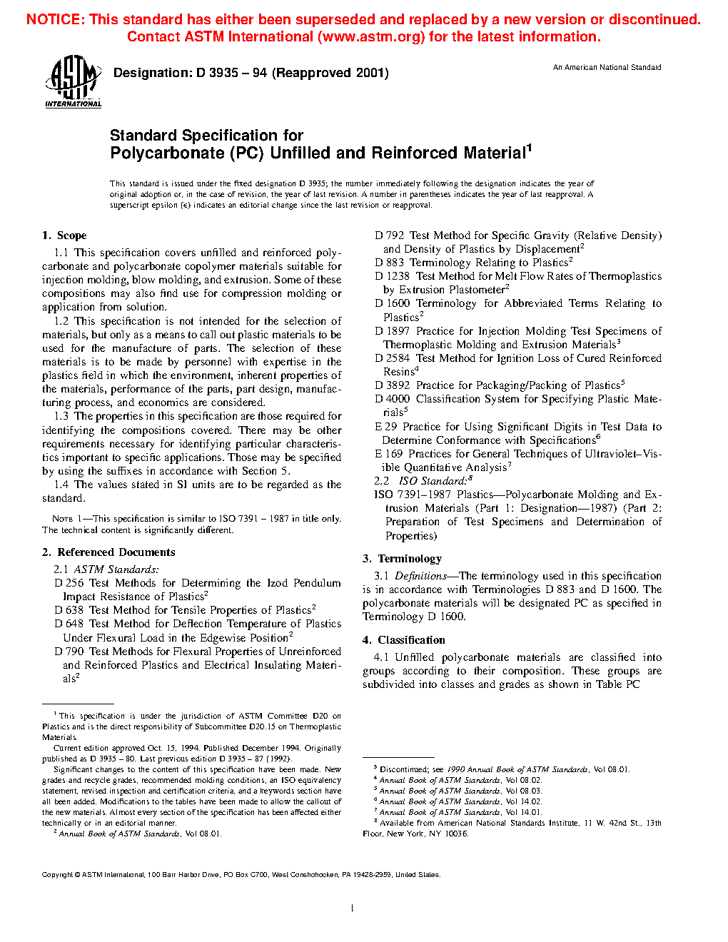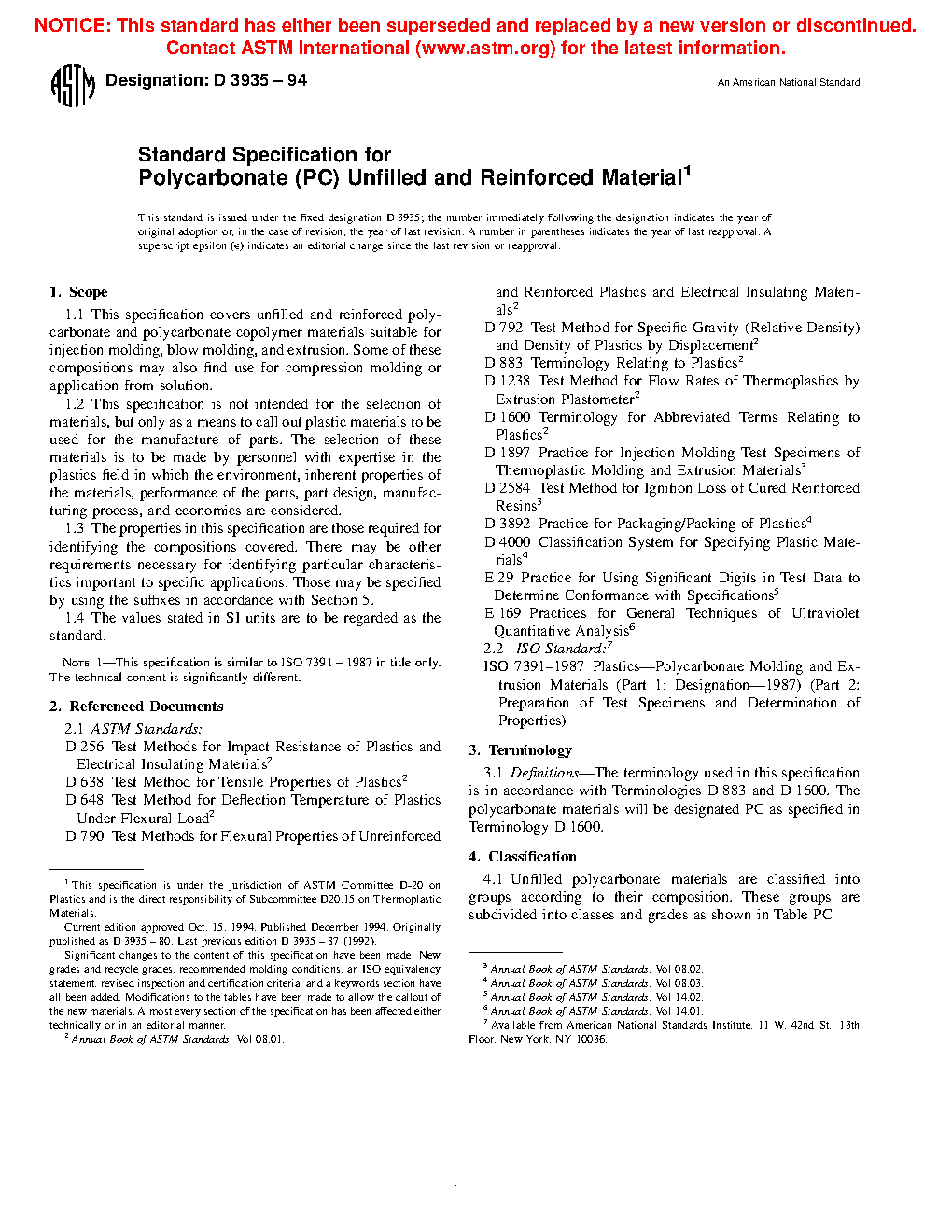 This specification covers unfilled and reinforced polycarbonate and polycarbonate copolymer materials suitable for injection molding, blow molding, and extrusion. Some of these compositions may also find use for compression molding or application from solution. Unfilled polycarbonate materials are classified into groups according to their composition. The groups are Group 01, Group 02, Group 03, Group 04, Group 05, and Group 06. These groups are subdivided into classes which are Class 0, Class 1, Class 2, Class 3, and Class 4 and these classes can be further be subdivided into grades which are Grade 1, Grade 2, Grade 3, Grade 4, Grade 5, Grade 6, Grade 7 and Grade 0. Different tests shall be conducted in order to determine the following properties of polymer materials: Izod impact strength, flexural modulus, tensile strength, and deflection temperature.
