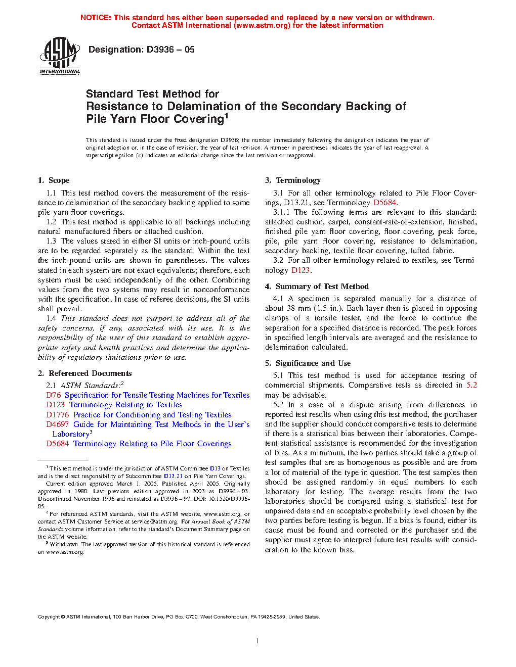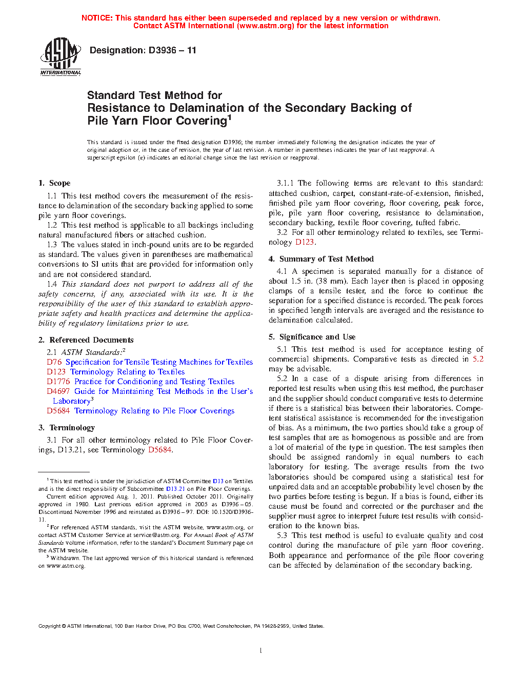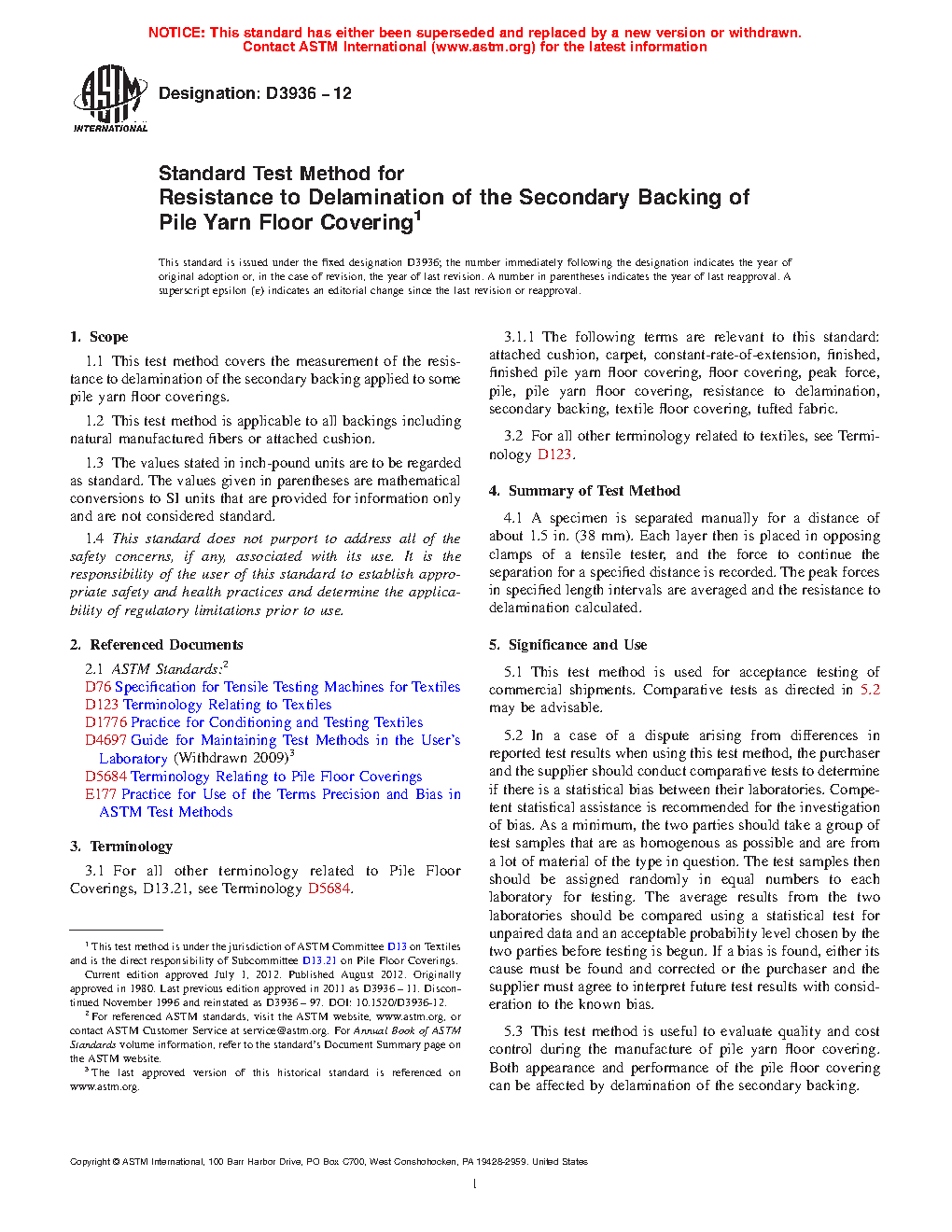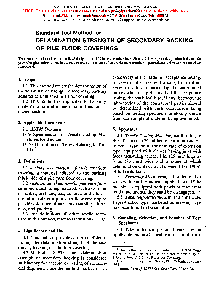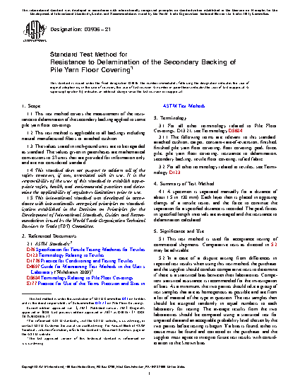 Standard Test Method for Delamination Strength of Secondary Backing of Pile Floor coverings