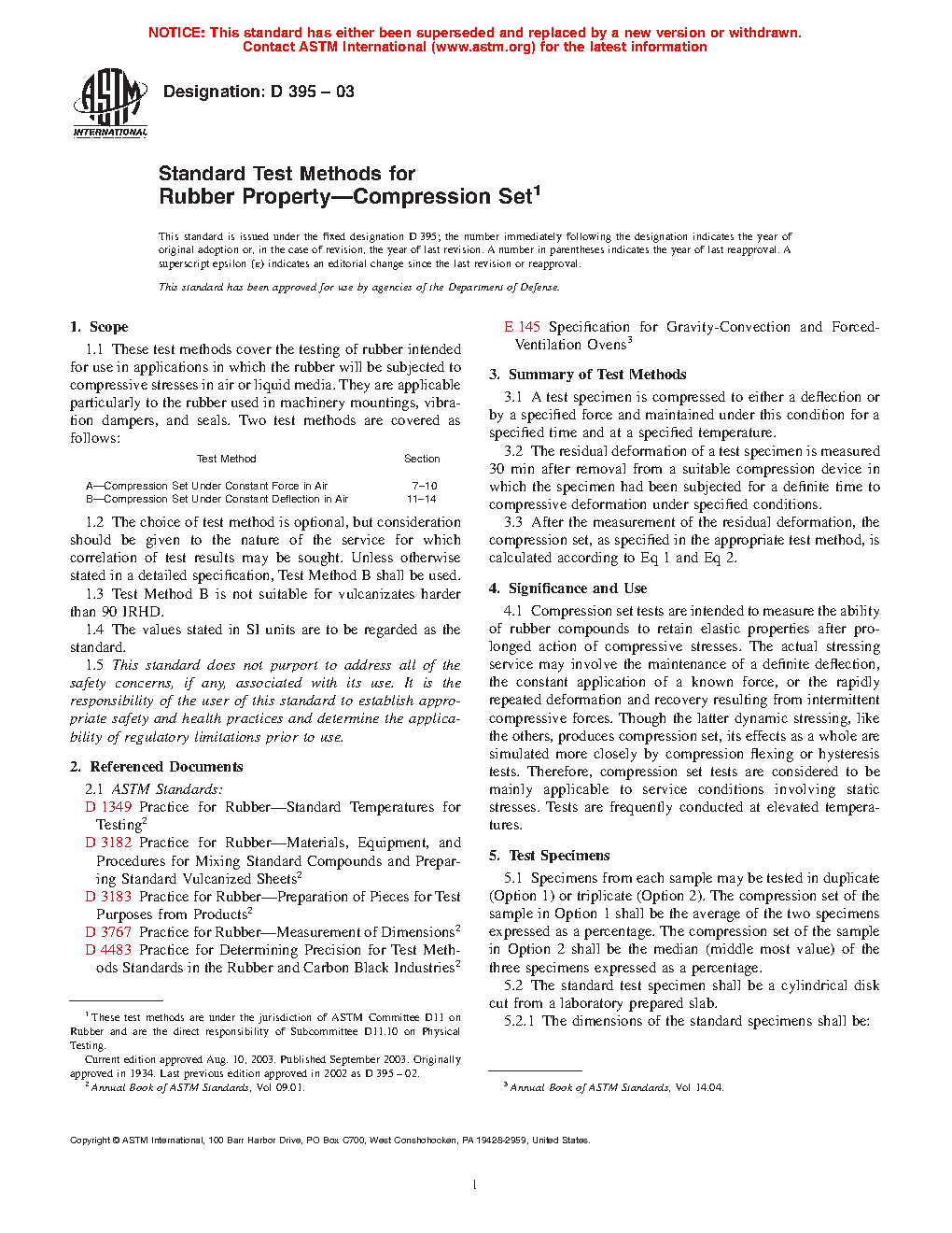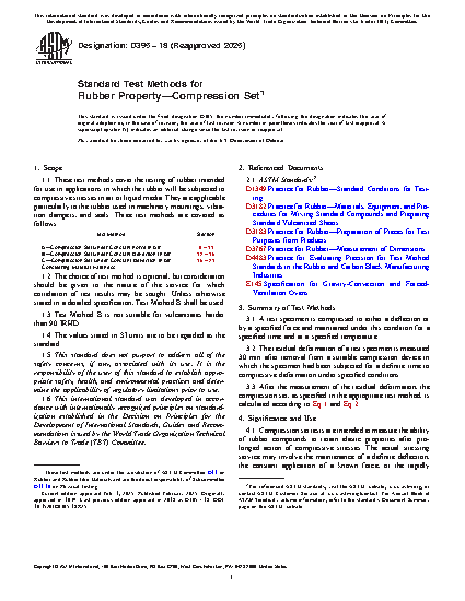1.1 These test methods cover the testing of rubber intended for use in applications in which the rubber will be subjected to compressive stresses in air or liquid media. They are applicable particularly to the rubber used in machinery mountings, vibration dampers, and seals. Two test methods are covered as follows: