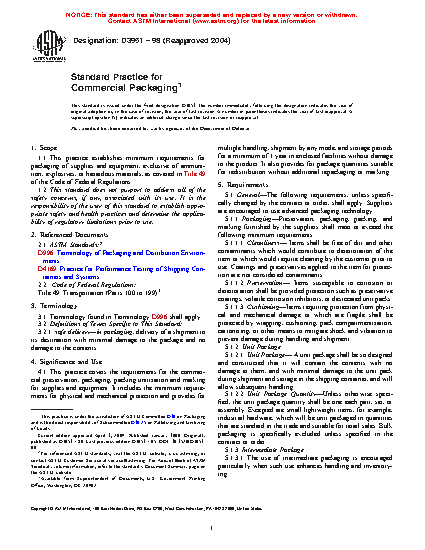 1.1 This practice establishes minimum requirements for packaging of supplies and equipment, exclusive of ammunition, explosives, or hazardous materials, as covered in Title 49 of the Code of Federal Regulations.