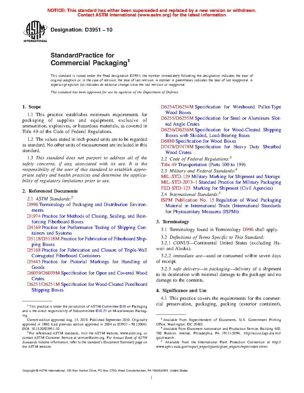 This practice covers the requirements for the commercial preservation, packaging, packing unitization and marking for supplies and equipment. It includes the minimum requirements for physical and mechanical protection and provides for multiple handling, shipment by any mode, and storage periods for a minimum of 1 year in enclosed facilities without damage to the product. It also provides for package quantities suitable for redistribution without additional repackaging or marking.