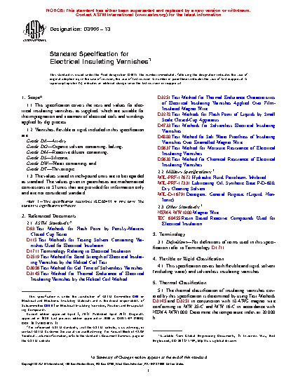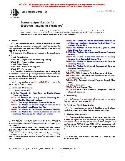 This specification covers the tests and values for electrical insulating varnishes, as supplied, which are suitable for the impregnation and treatment of electrical coils and windings applied by dip process. The varnishes are classified according to grades: Grade DA; Grade DO; Grade DM; Grade DS; Grade DW; and Grade DT. This specification covers both flexible and rigid, solvent and solventless insulating varnishes. The insulating varnishes are classified according to thermal classes: Class 130; Class 155; Class 180; Class 200; and Class 220. Quality conformance tests shall be performed to conform to the specified requirements.