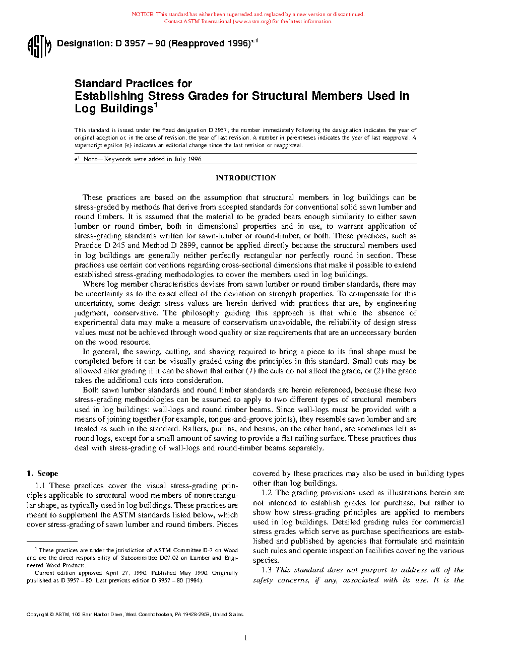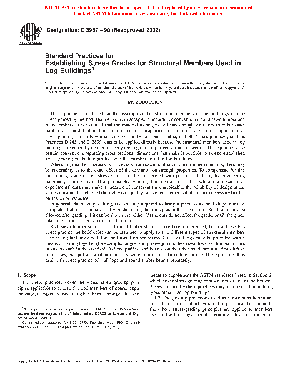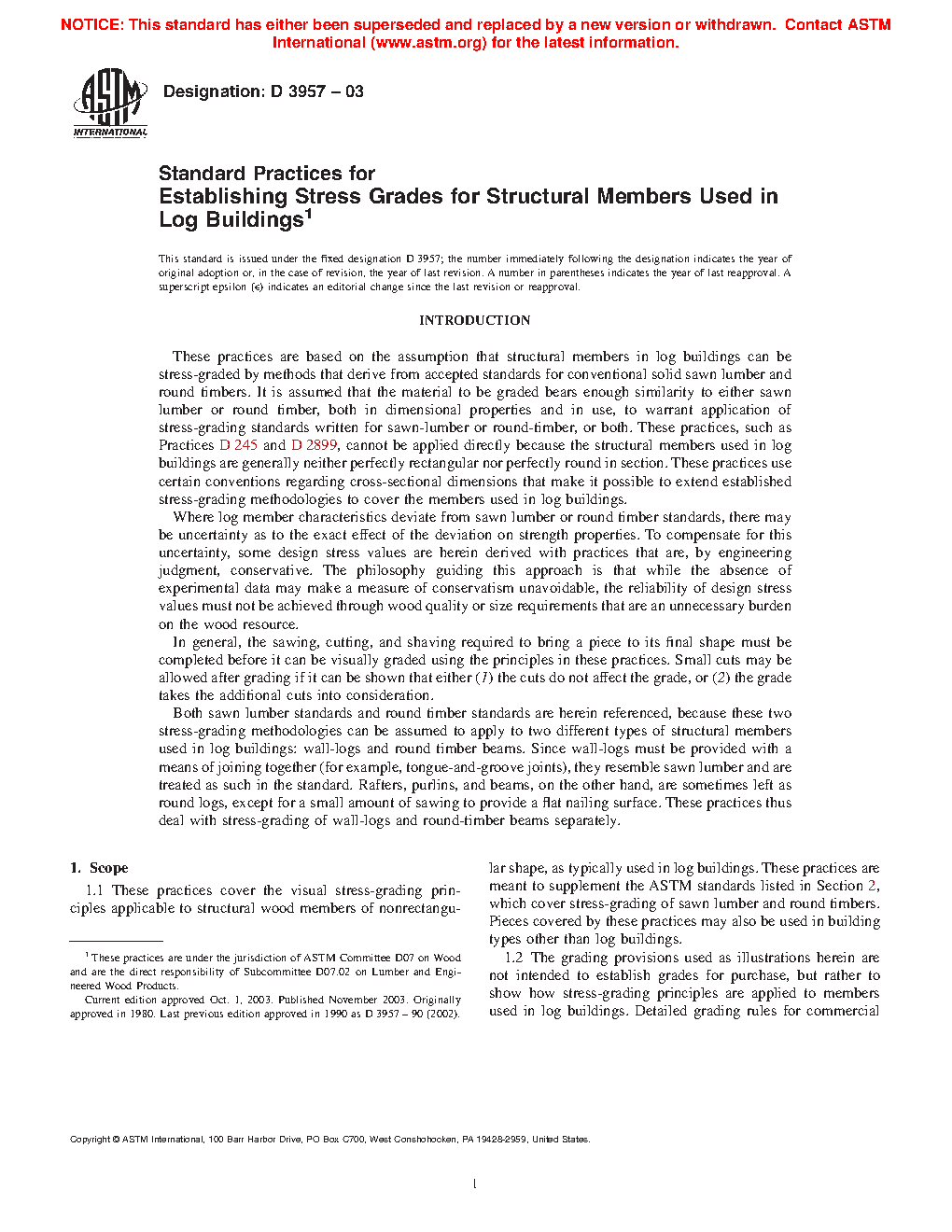 These practices cover the visual stress-grading principles applicable to structural wood members of nonrectangular shape, as typically used in log buildings. Both sawn lumber and round timber stress-grading methodologies are applied to two different types of structural members used in log buildings: wall-logs and round timber beams. The development of design stress values from clear wood strength values for wall-logs and round timber beams for used in log buildings is demonstrated in this standard. However, the grading provisions presented herein are not intended to establish grades for purchase, but rather to show how stress-grading principles are applied to members used in log buildings.