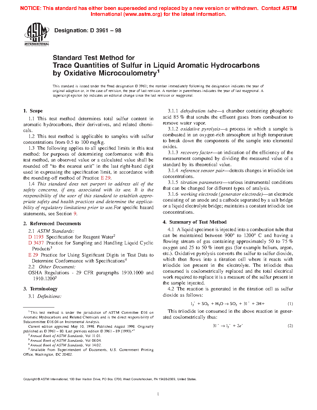 Standard Test Method for Trace Quantities of Sulfur in Liquid Aromatic Hydrocarbons by Oxidative Microcoulometry (Withdrawn 2004)