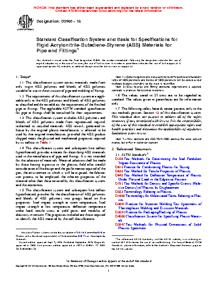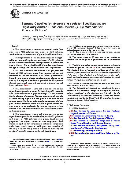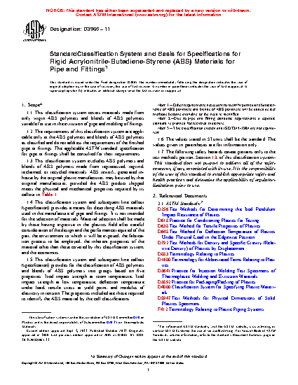 1.4 This classification system and subsequent line callout (specification) provides a means for describing ABS materials used in the manufacture of pipe and fittings. It is not intended for the selection of materials. Material selection shall be made by those having expertise in the plastics field after careful consideration of the design and the performance required of the part, the environment to which it will be exposed, the fabrication process to be employed, the inherent properties of the material other than those covered by this classification system, and the economics.