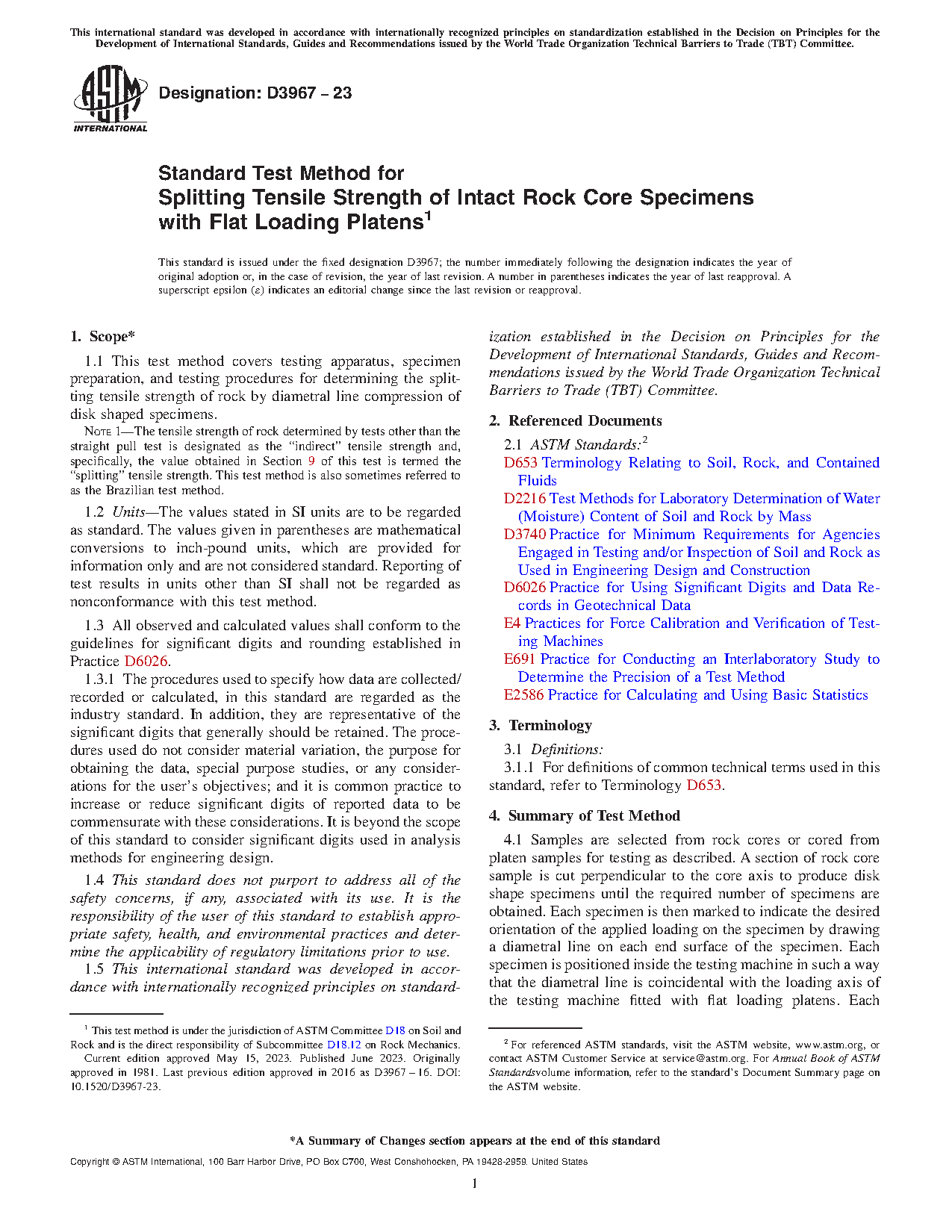 1.1 This test method covers testing apparatus, specimen preparation, and testing procedures for determining the splitting tensile strength of rock by diametral line compression of a disk.