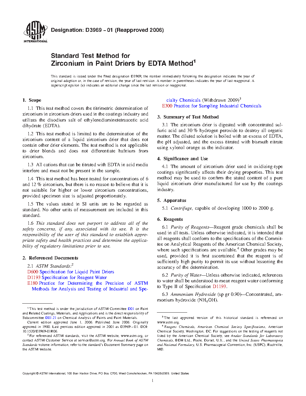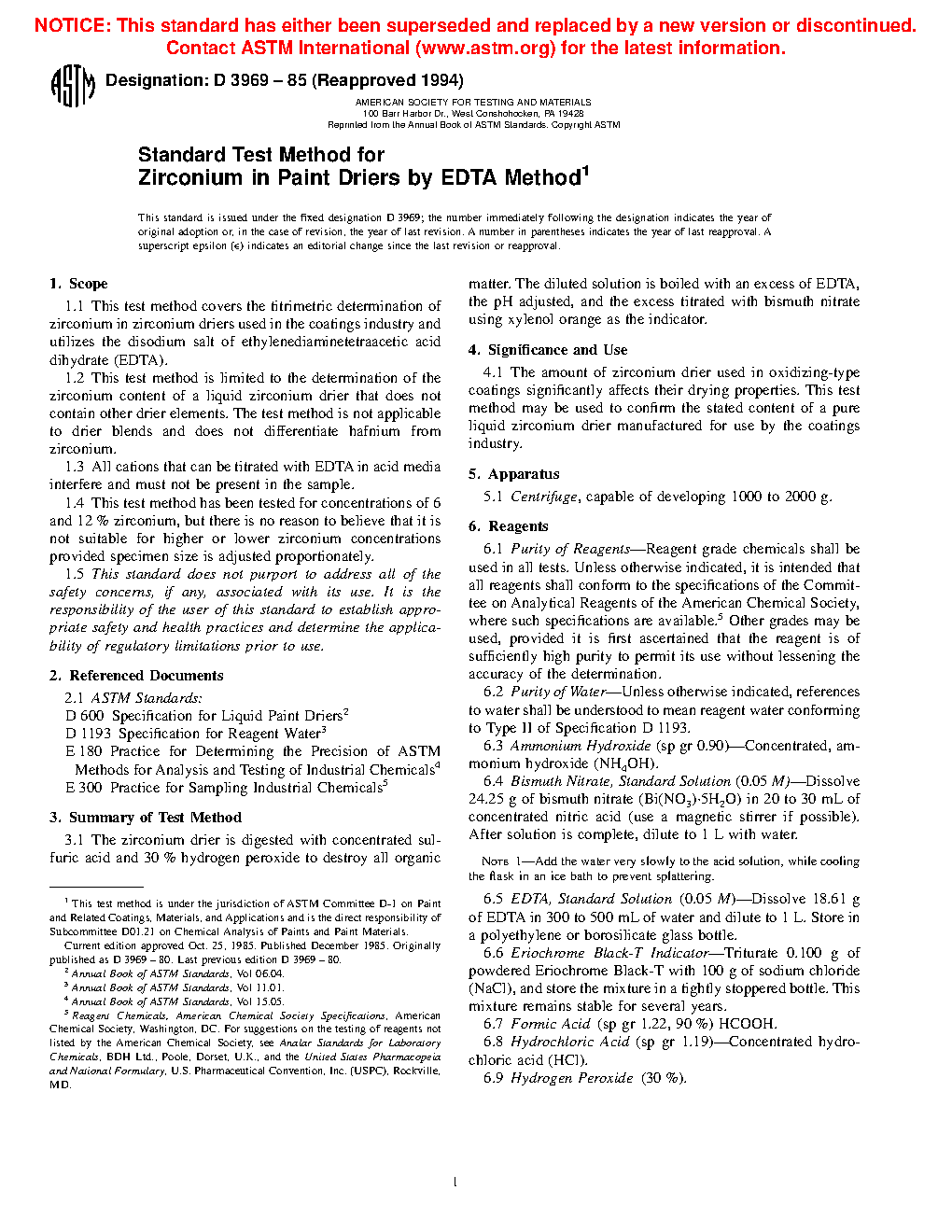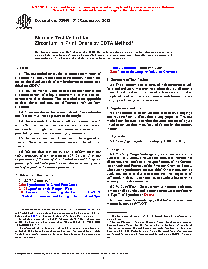 1.1 This test method covers the titrimetric determination of zirconium in zirconium driers used in the coatings industry and utilizes the disodium salt of ethylenediaminetetraacetic acid dihydrate (EDTA).