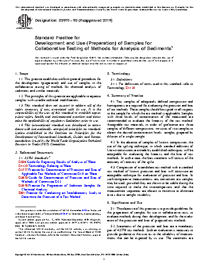 1.1 This practice establishes uniform general procedures for the development, (preparation) and use of samples in the collaborative testing of methods for chemical analysis of sediments and similar materials.