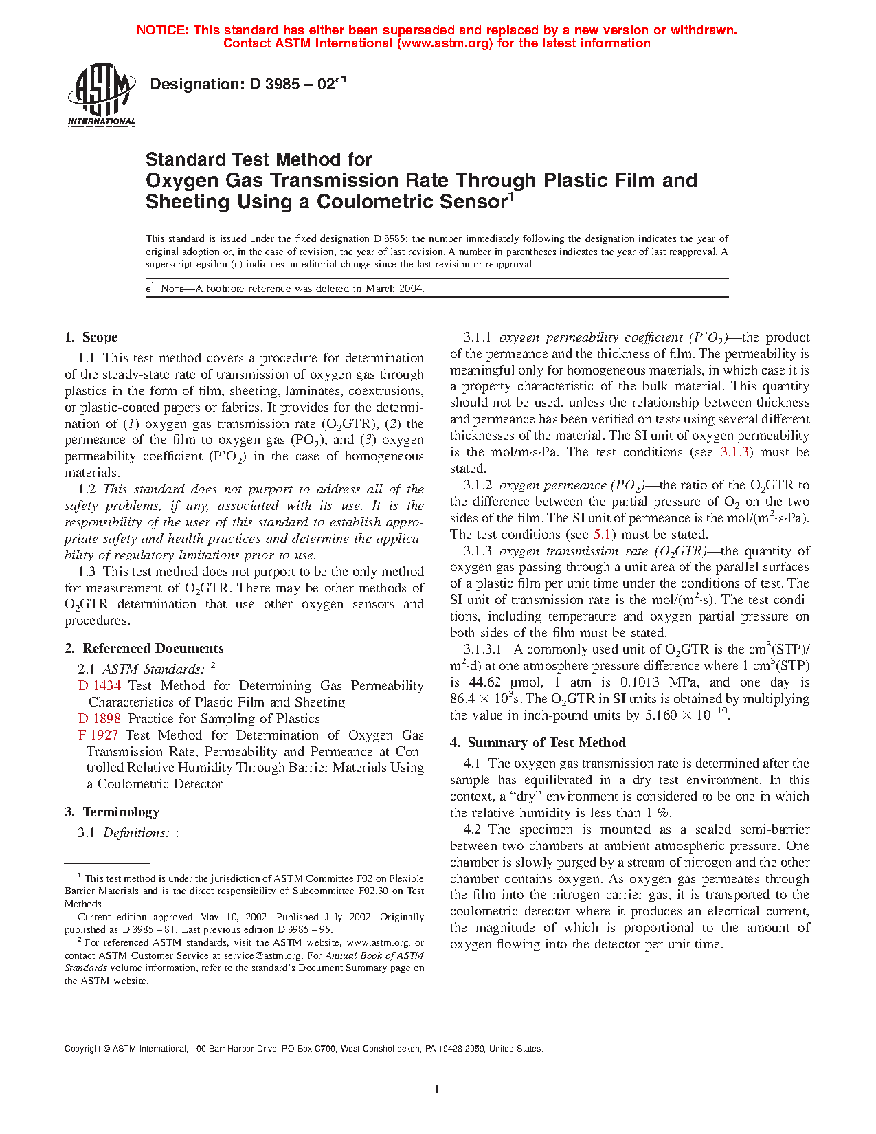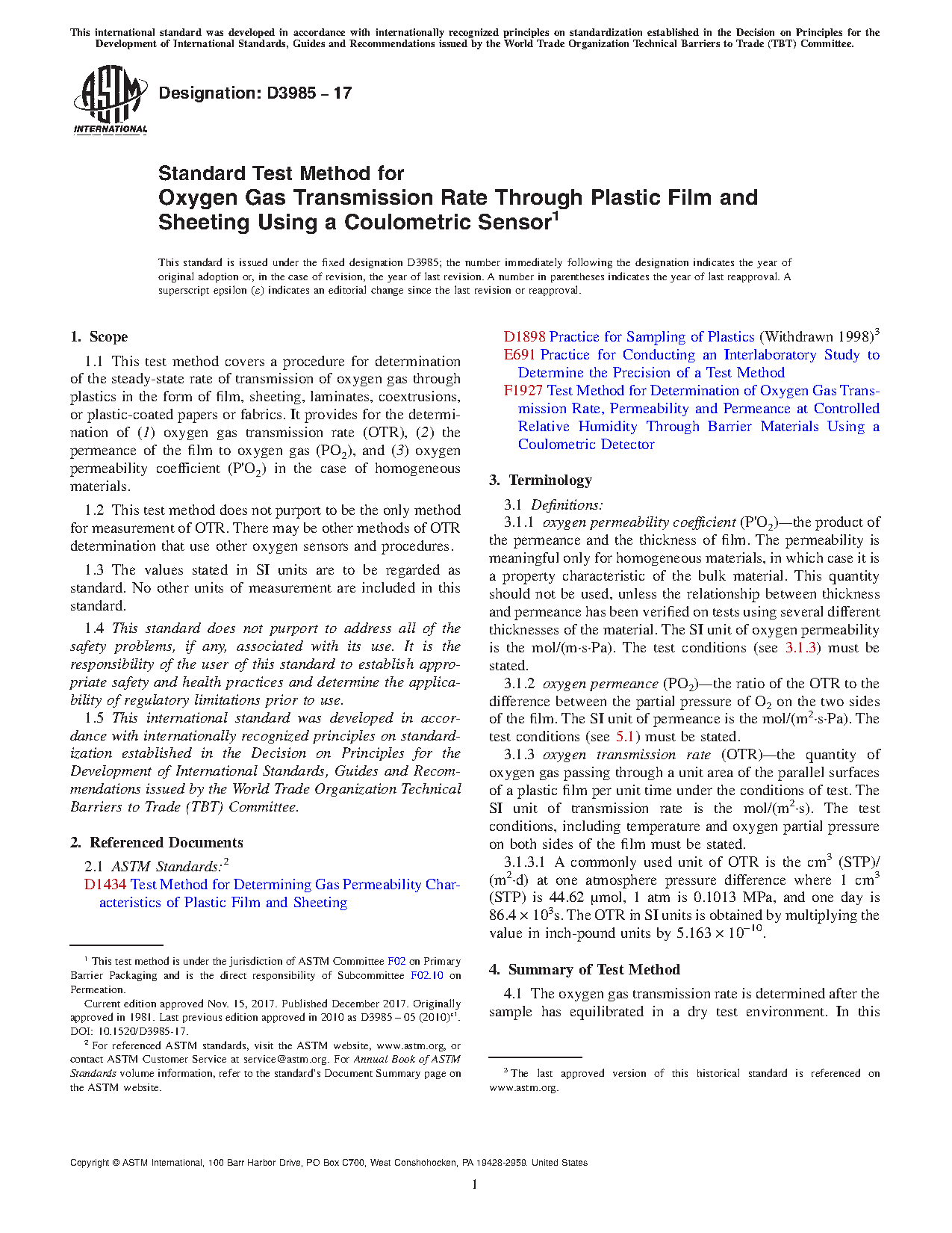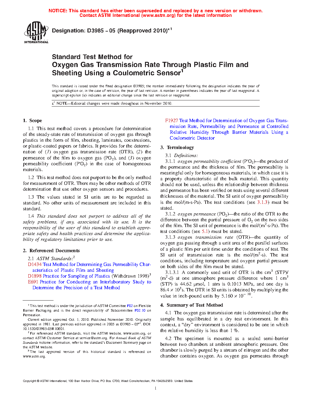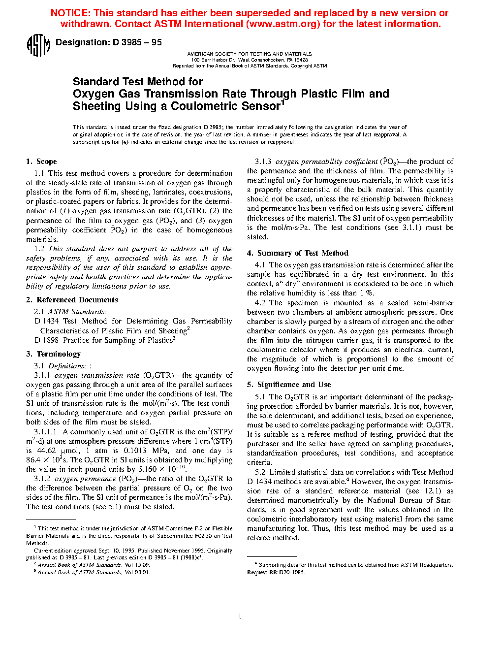5.2 Limited statistical data on correlations with Test Method D1434 methods are available4; however, the oxygen transmission rate of a standard reference material (see 12.1) as determined manometrically by NIST, is in good agreement with the values obtained in the coulometric interlaboratory test using material from the same manufacturing lot. Thus, this test method may be used as a referee method.