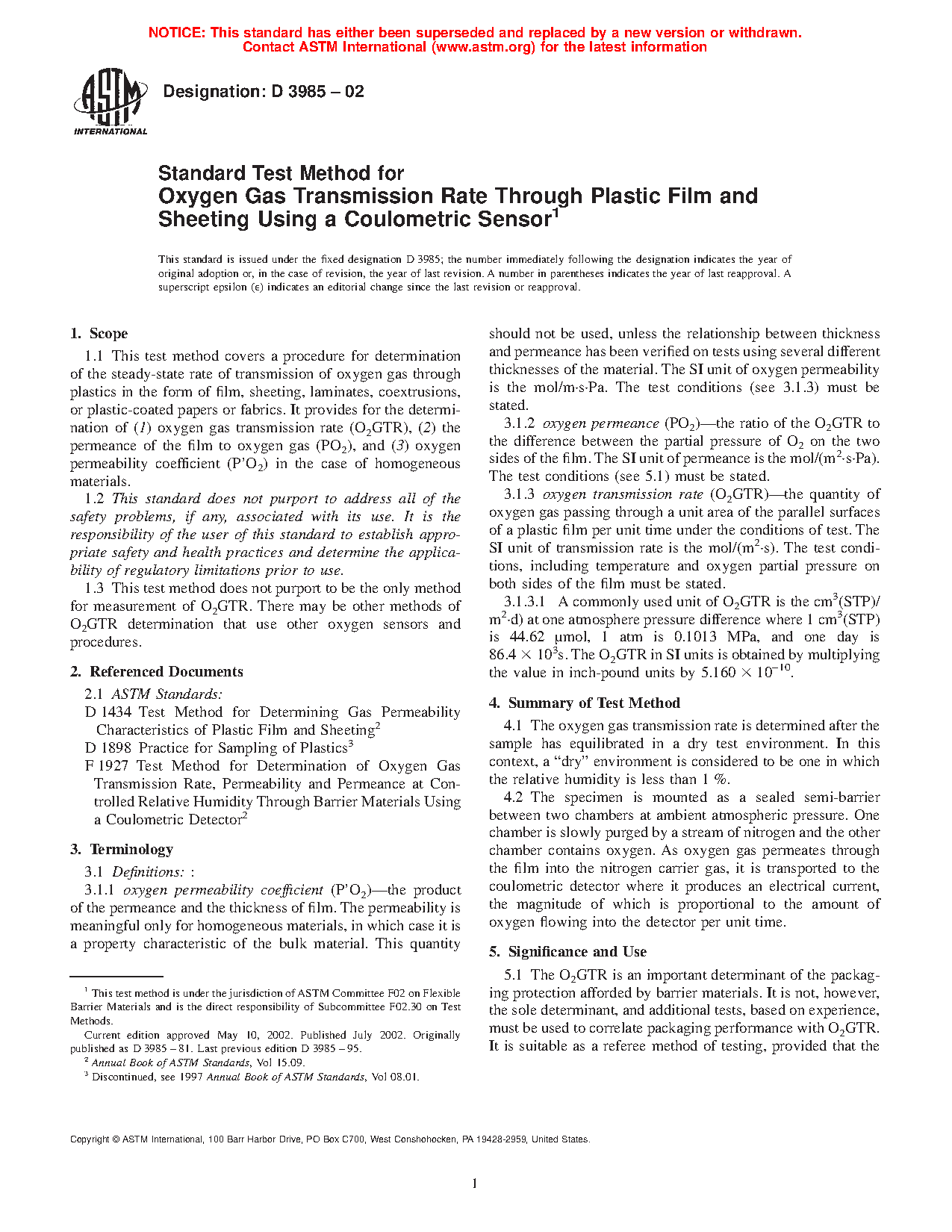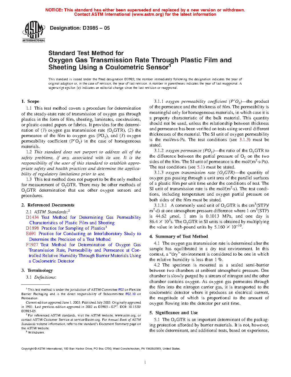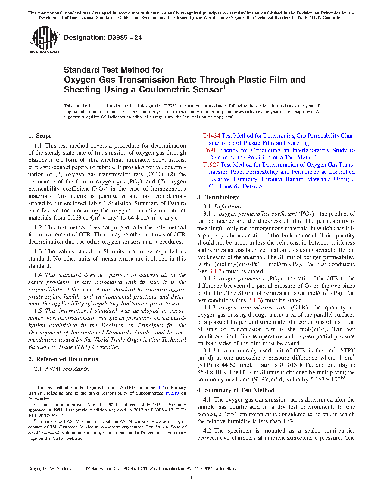 1.1 This test method covers a procedure for determination of the steady-state rate of transmission of oxygen gas through plastics in the form of film, sheeting, laminates, coextrusions, or plastic-coated papers or fabrics. It provides for the determination of (1) oxygen gas transmission rate (OTR), (2) the permeance of the film to oxygen gas (PO2), and (3) oxygen permeability coefficient (P′O2) in the case of homogeneous materials.