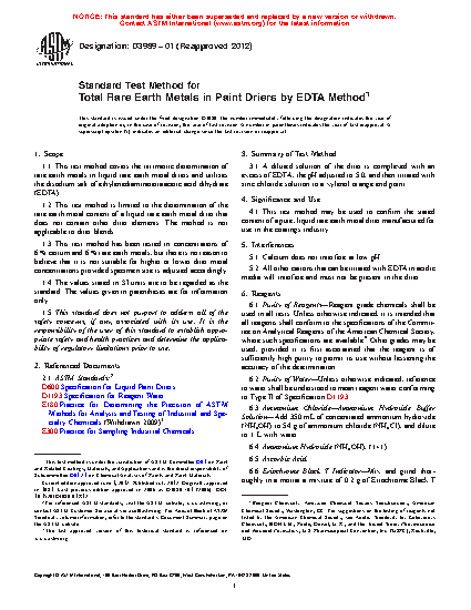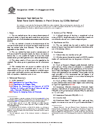1.1 This test method covers the titrimetric determination of rare earth metals in liquid rare earth metal driers and utilizes the disodium salt of ethylenediaminetetraacetic acid dihydrate (EDTA).