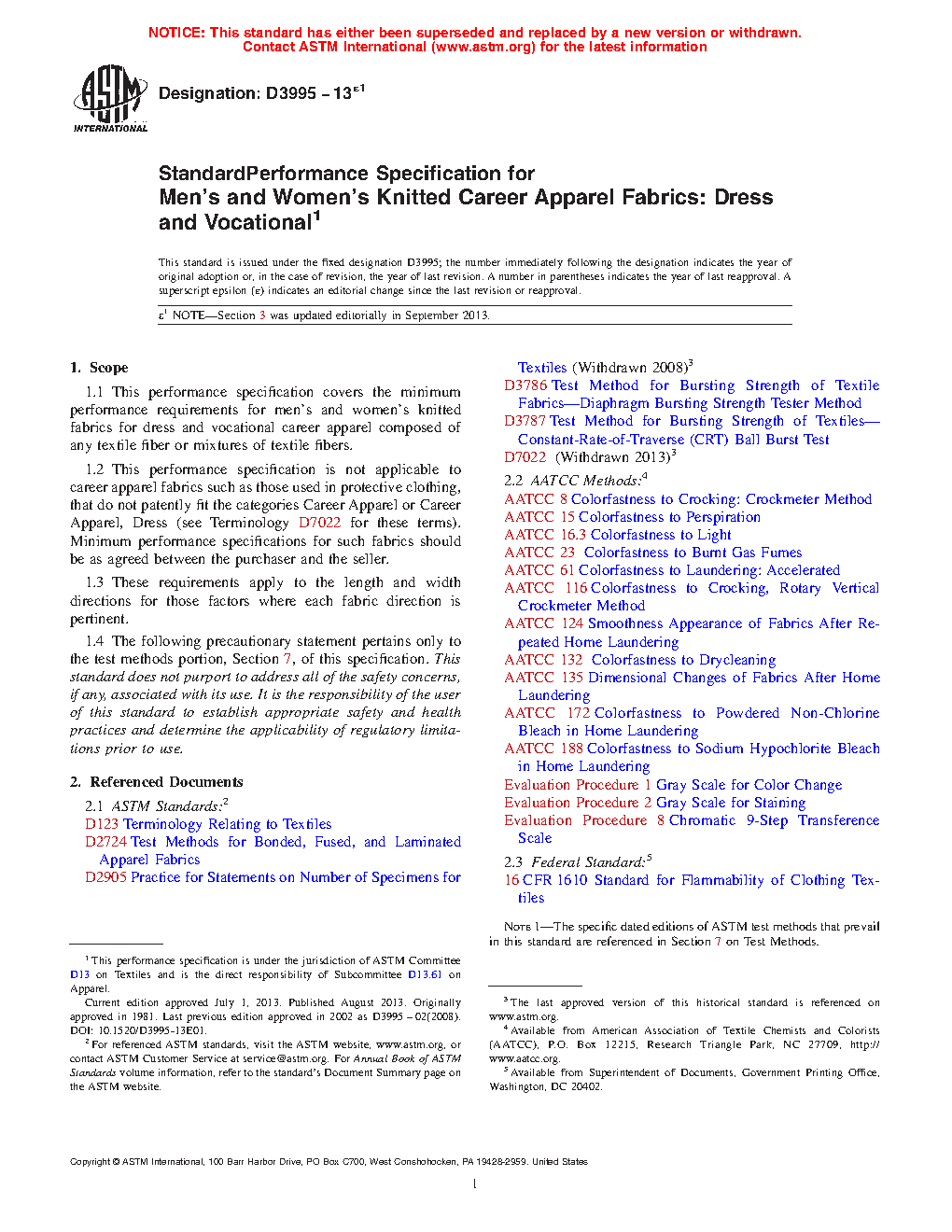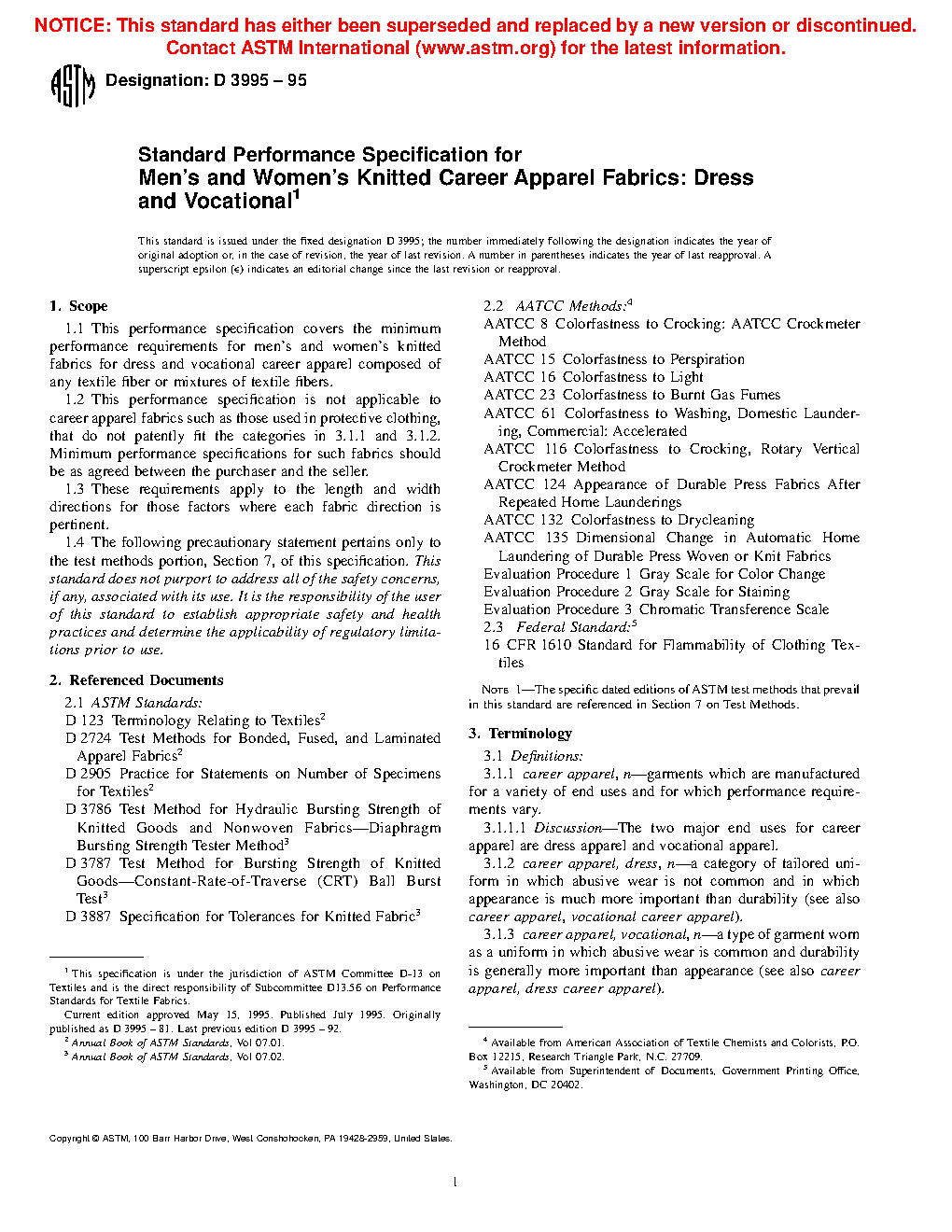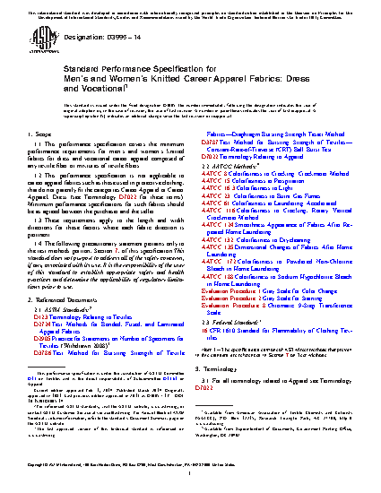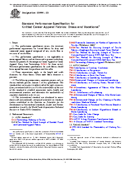 1.1 This performance specification covers the minimum performance requirements for knitted fabrics for dress and vocational career apparel composed of any textile fiber or mixtures of textile fibers.