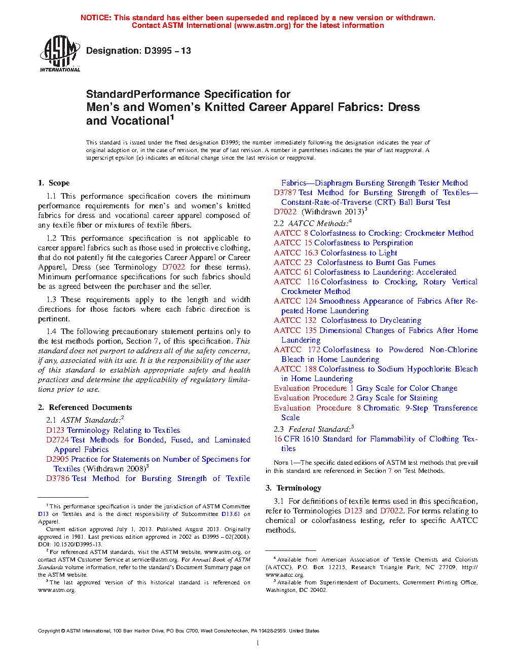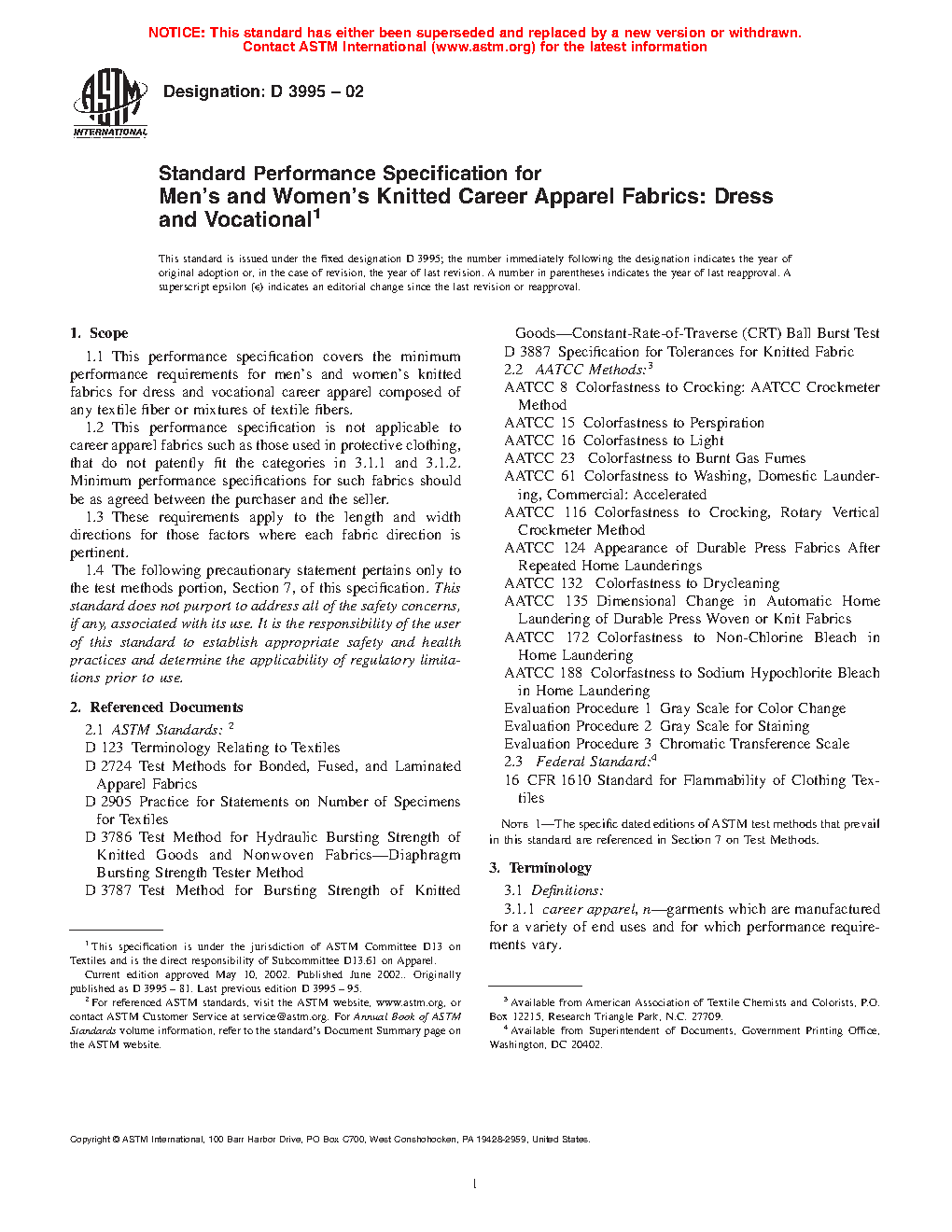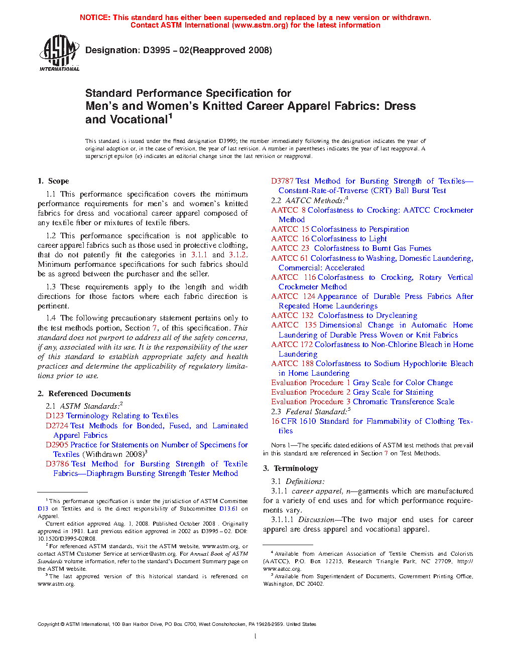 1.1 This performance specification covers the minimum performance requirements for knitted fabrics for dress and vocational career apparel composed of any textile fiber or mixtures of textile fibers.