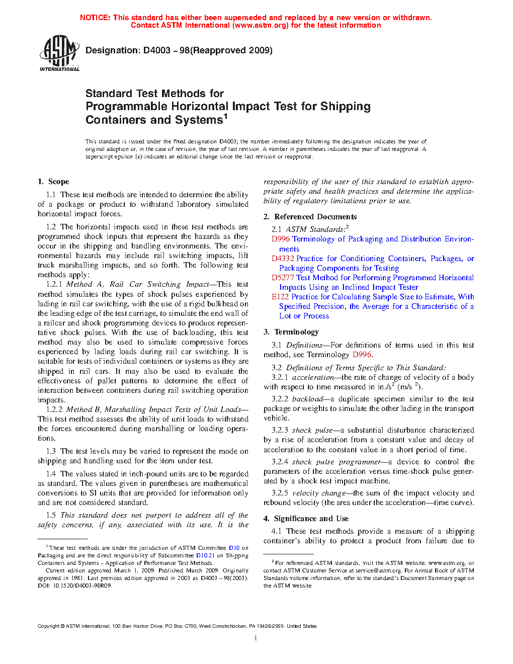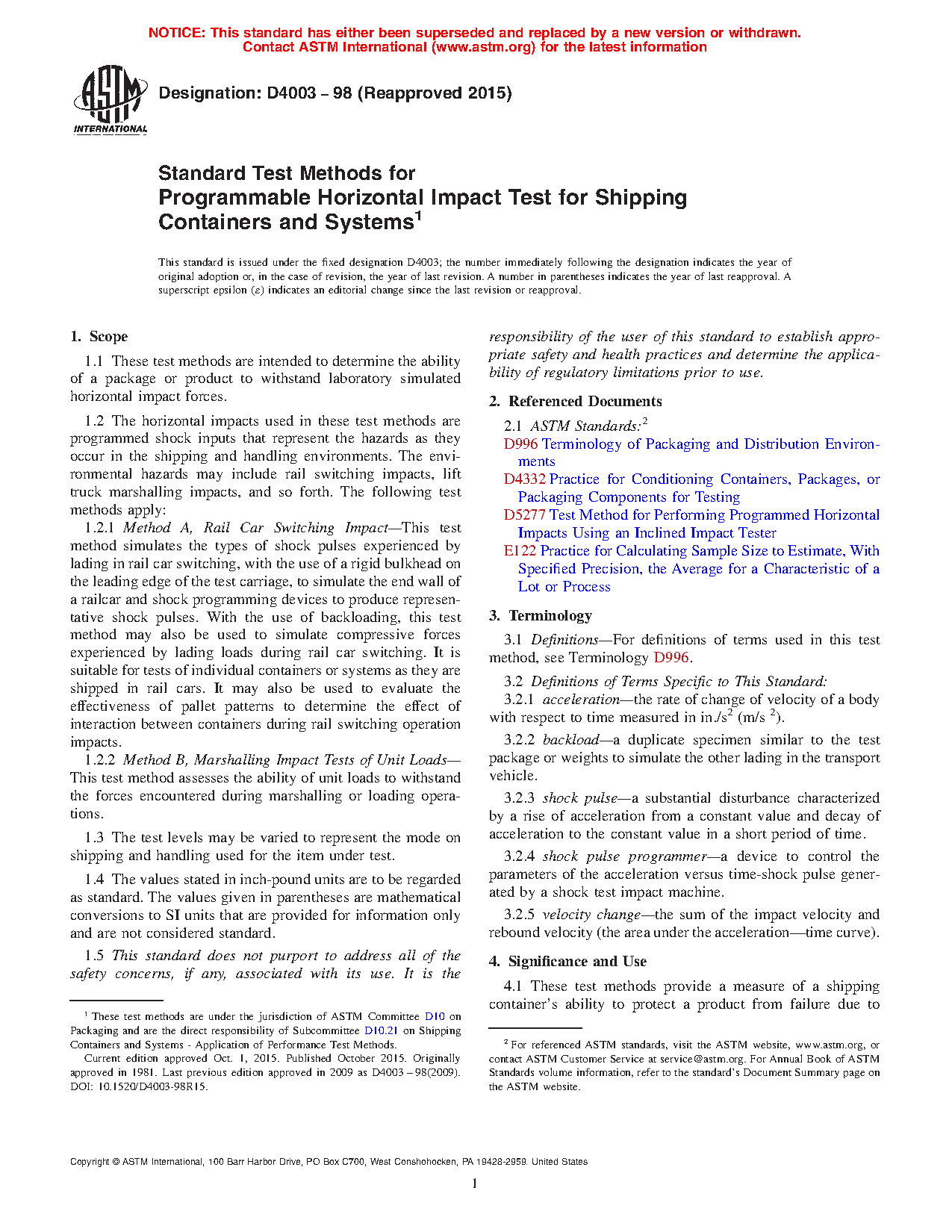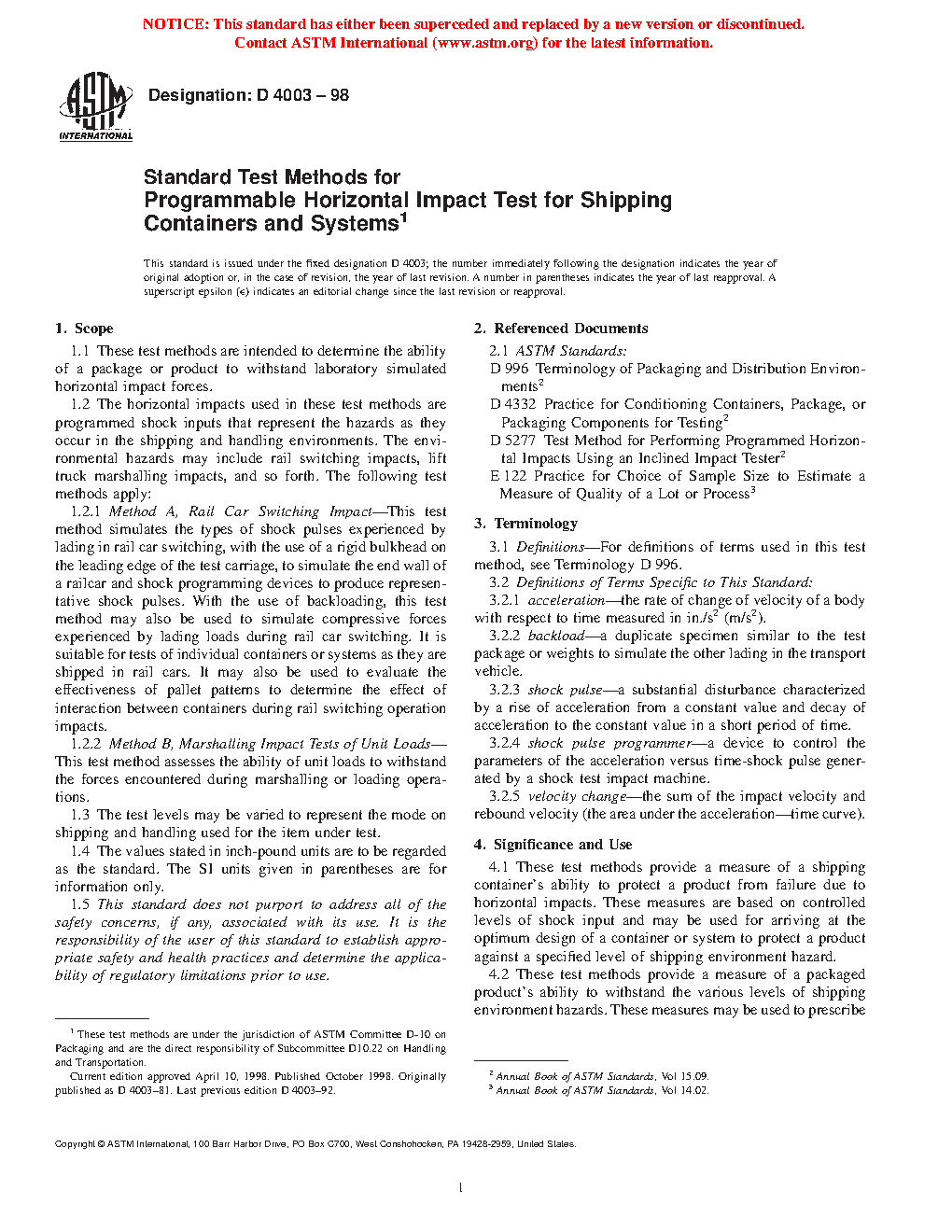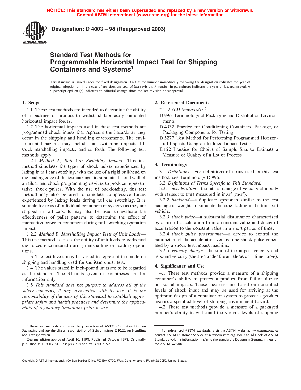 1.2 The horizontal impacts used in these test methods are programmed shock inputs that represent the hazards as they occur in the shipping and handling environments. The environmental hazards may include rail switching impacts, lift truck marshalling impacts, and so forth. The following test methods apply:
