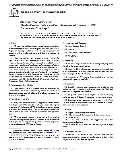 1.1 This test method describes a simple procedure to determine the completeness of fusion of poly(vinyl chloride) (PVC) dispersion coatings on fabric. This test applies primarily to coatings with a mechanical bond and does not include tie coating.