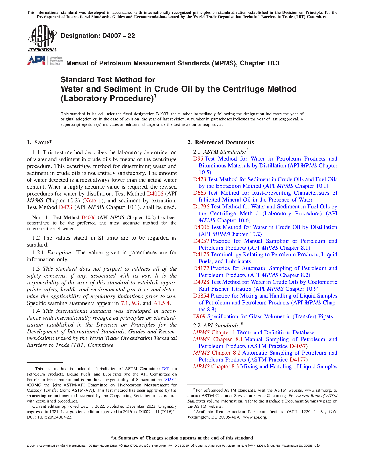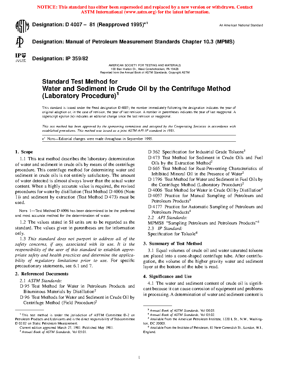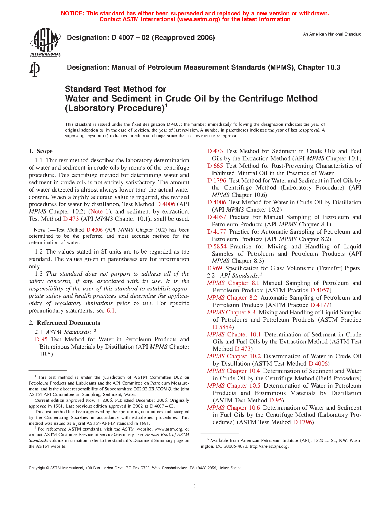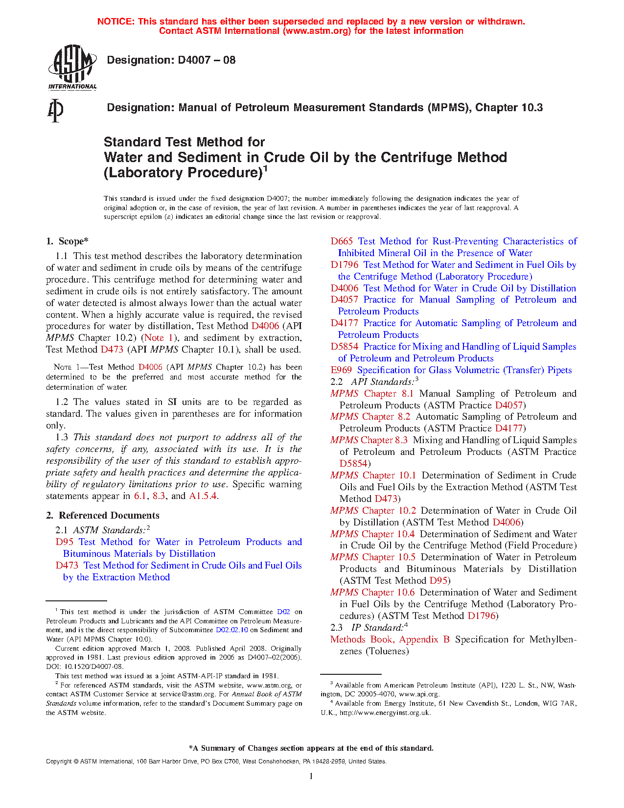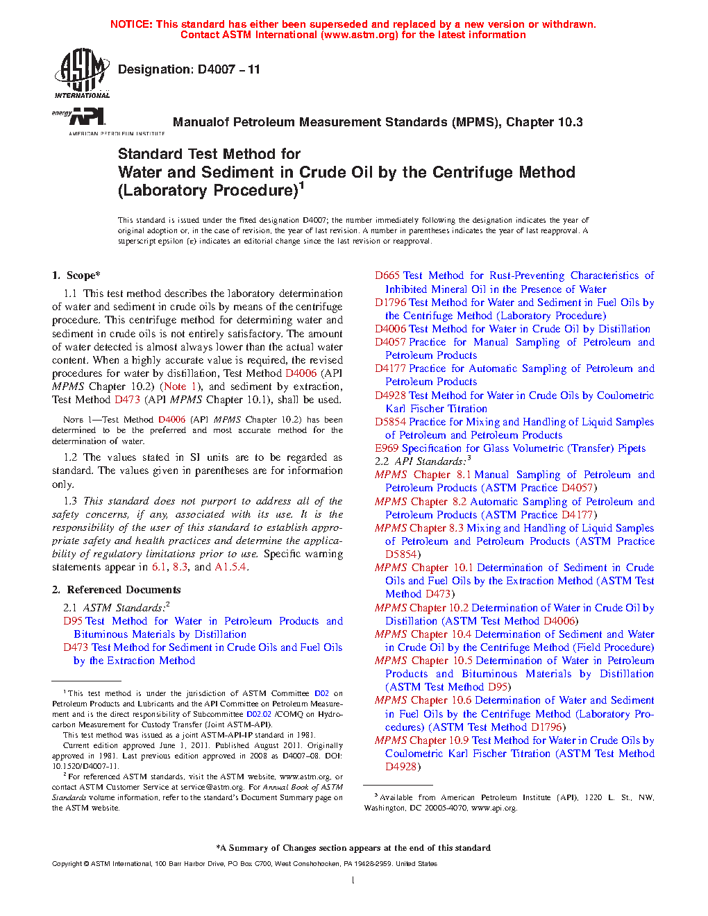 1.1 This test method describes the laboratory determination of water and sediment in crude oils by means of the centrifuge procedure. This centrifuge method for determining water and sediment in crude oils is not entirely satisfactory. The amount of water detected is almost always lower than the actual water content. When a highly accurate value is required, the revised procedures for water by distillation, Test Method D 4006 Note 1—Test Method D 4006