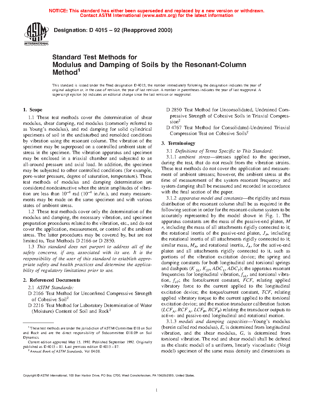 1.1 These test methods cover the determination of shear modulus and shear damping as a function of shear strain amplitude for solid cylindrical specimens of soil in intact and remolded conditions by vibration using resonant column devices. The vibration of the specimen may be superposed on a controlled static state of stress in the specimen. The vibration apparatus and specimen may be enclosed in a triaxial chamber and subjected to an all-around pressure and axial load. In addition, the specimen may be subjected to other controlled conditions (for example, pore-water pressure, degree of saturation, temperature). These test methods of modulus and damping determination are considered nondestructive when the shear strain amplitudes of vibration are less than 10–2 % (10–4 in./in.), and many measurements may be made on the same specimen and with various states of static stress.