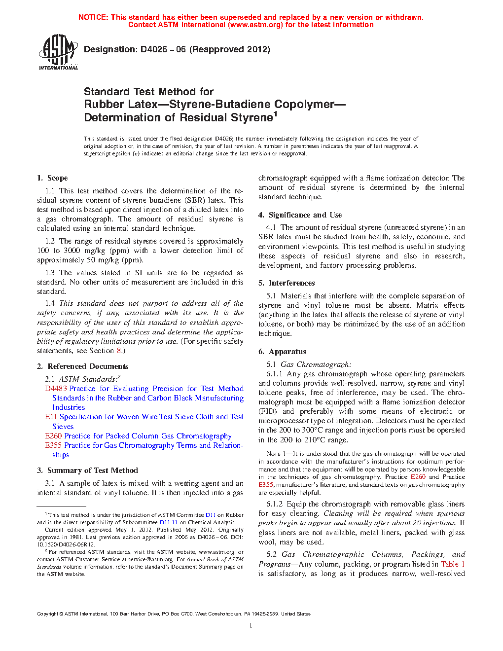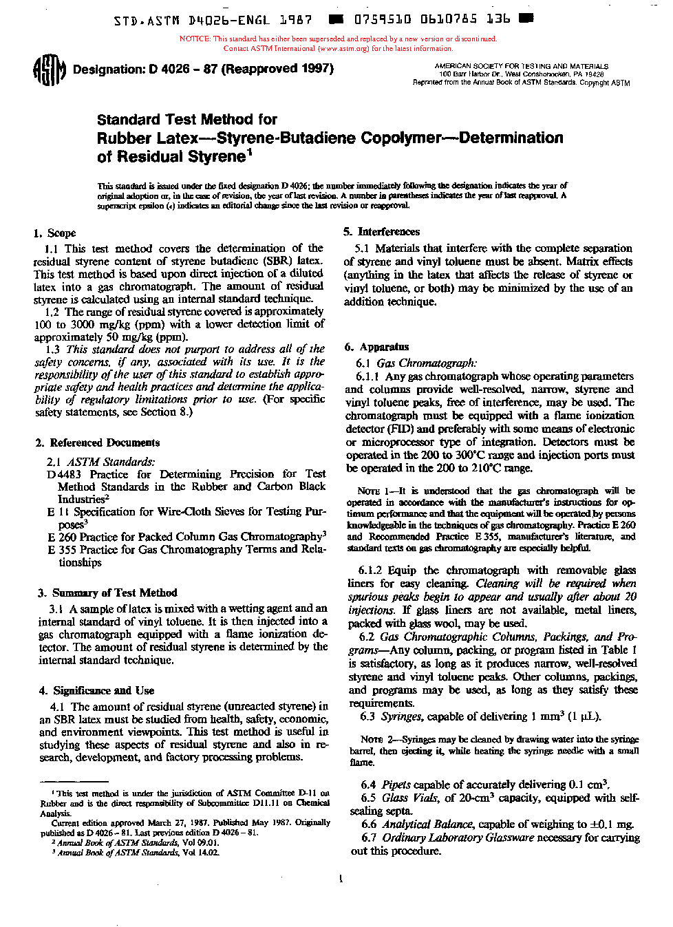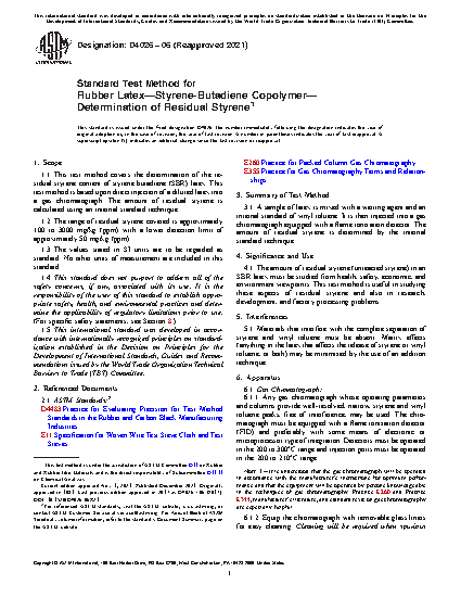 1.1 This test method covers the determination of the residual styrene content of styrene butadiene (SBR) latex. This test method is based upon direct injection of a diluted latex into a gas chromatograph. The amount of residual styrene is calculated using an internal standard technique.