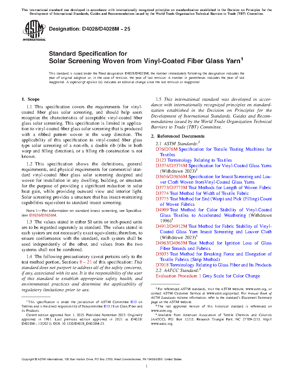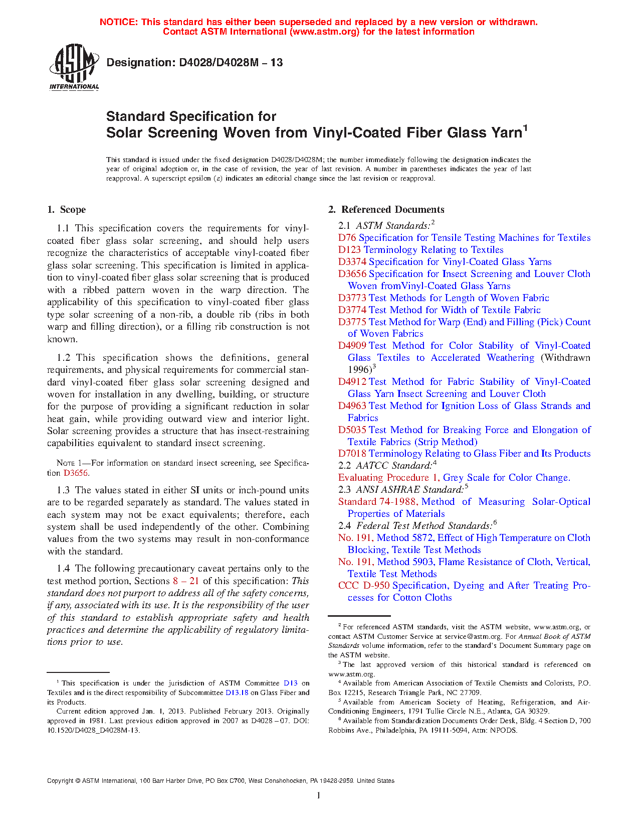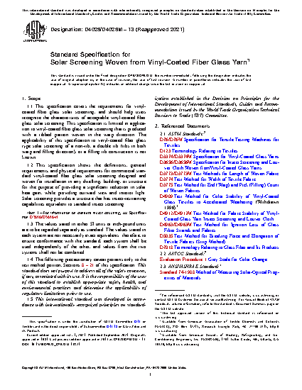 1.2 This specification shows the definitions, general requirements, and physical requirements for commercial standard vinyl-coated fiber glass solar screening designed and woven for installation in any dwelling, building, or structure for the purpose of providing a significant reduction in solar heat gain, while providing outward view and interior light. Solar screening provides a structure that has insect-restraining capabilities equivalent to standard insect screening.