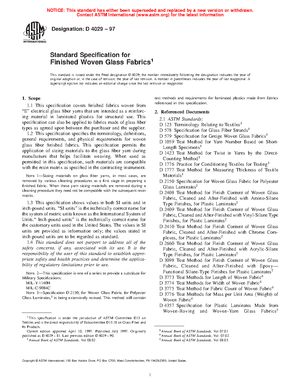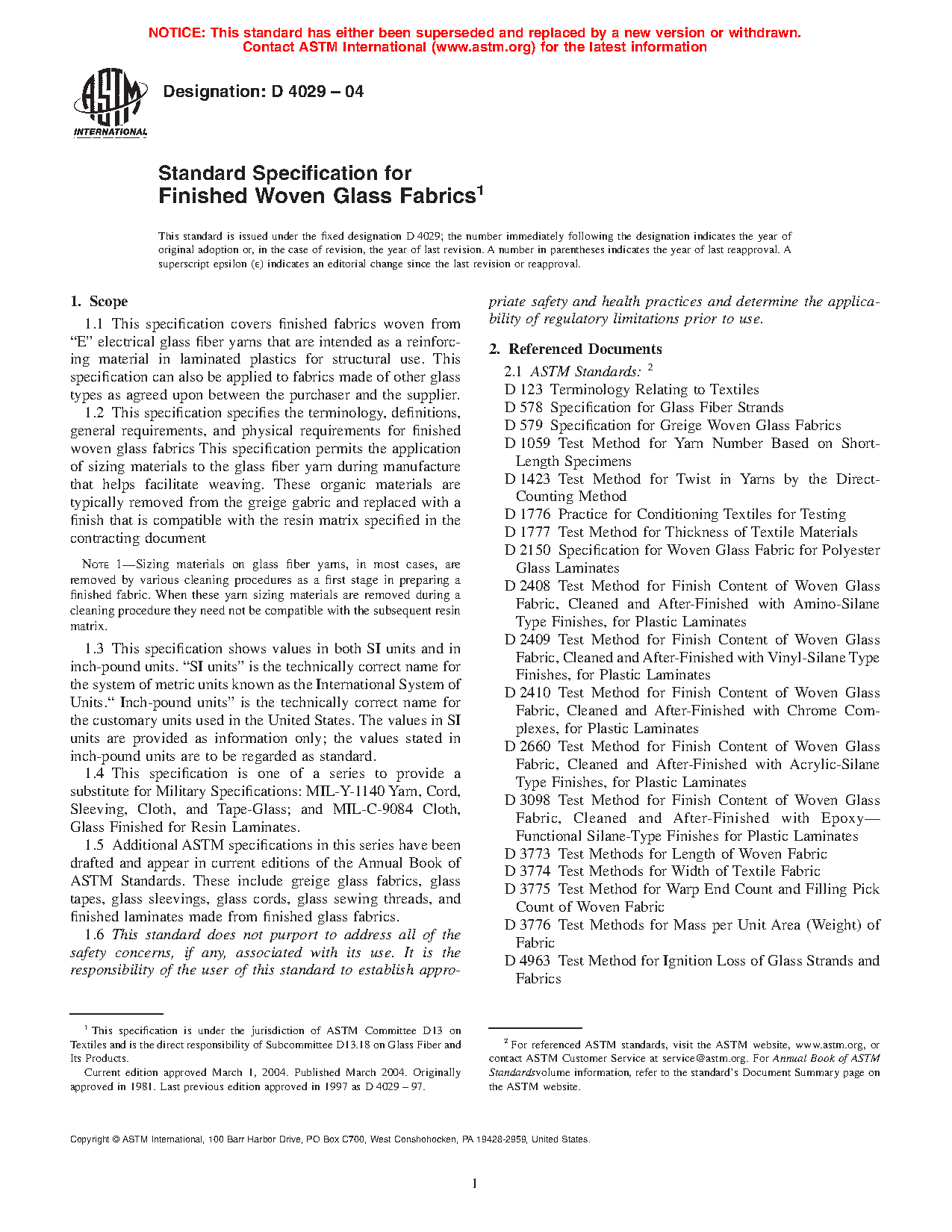 1.2 This specification specifies the terminology, definitions, general requirements, and physical requirements for finished woven glass fabrics This specification permits the application of sizing materials to the glass fiber yarn during manufacture that helps facilitate weaving. These organic materials are typically removed from the greige fabric and replaced with a finish that is compatible with the resin matrix specified in the contracting document