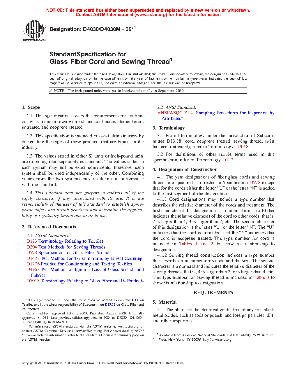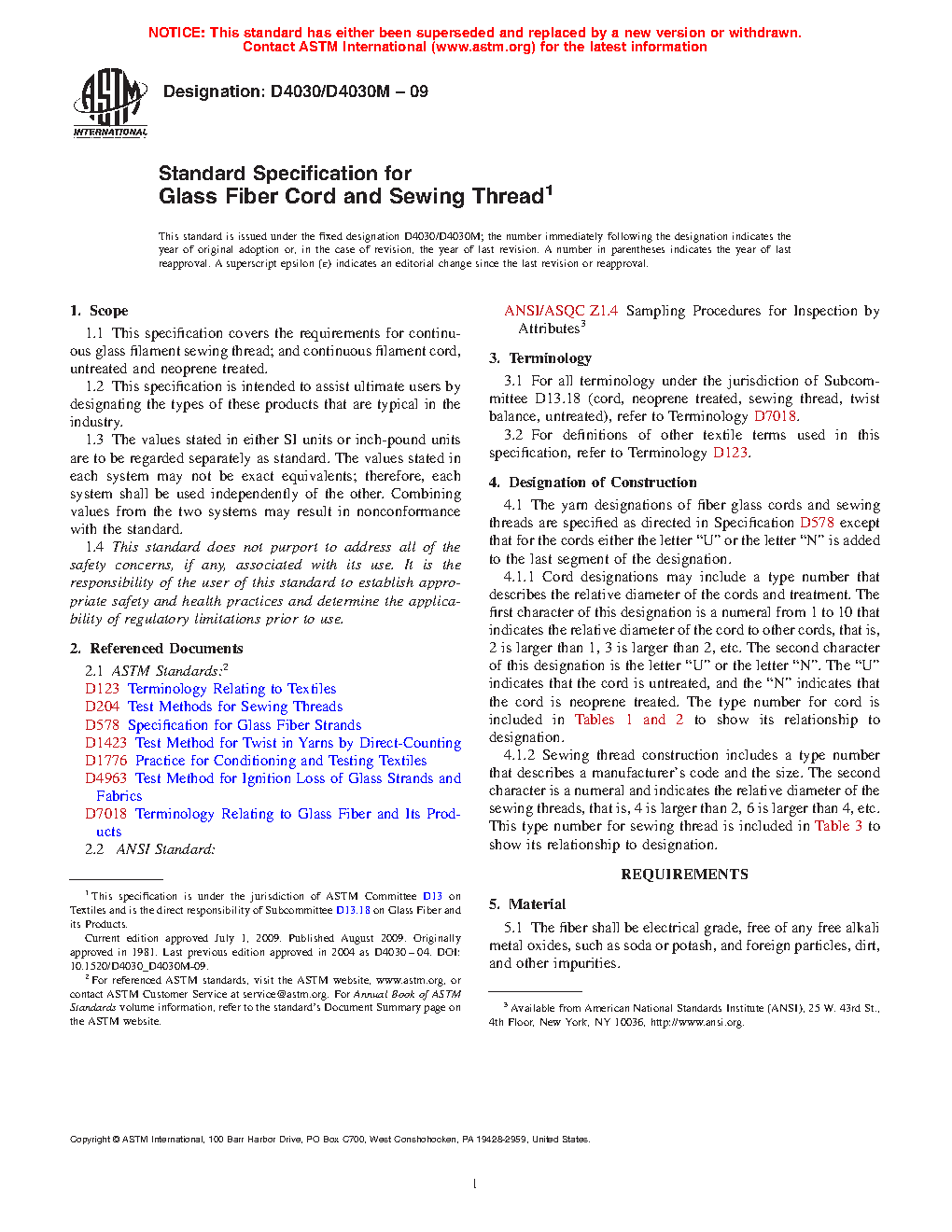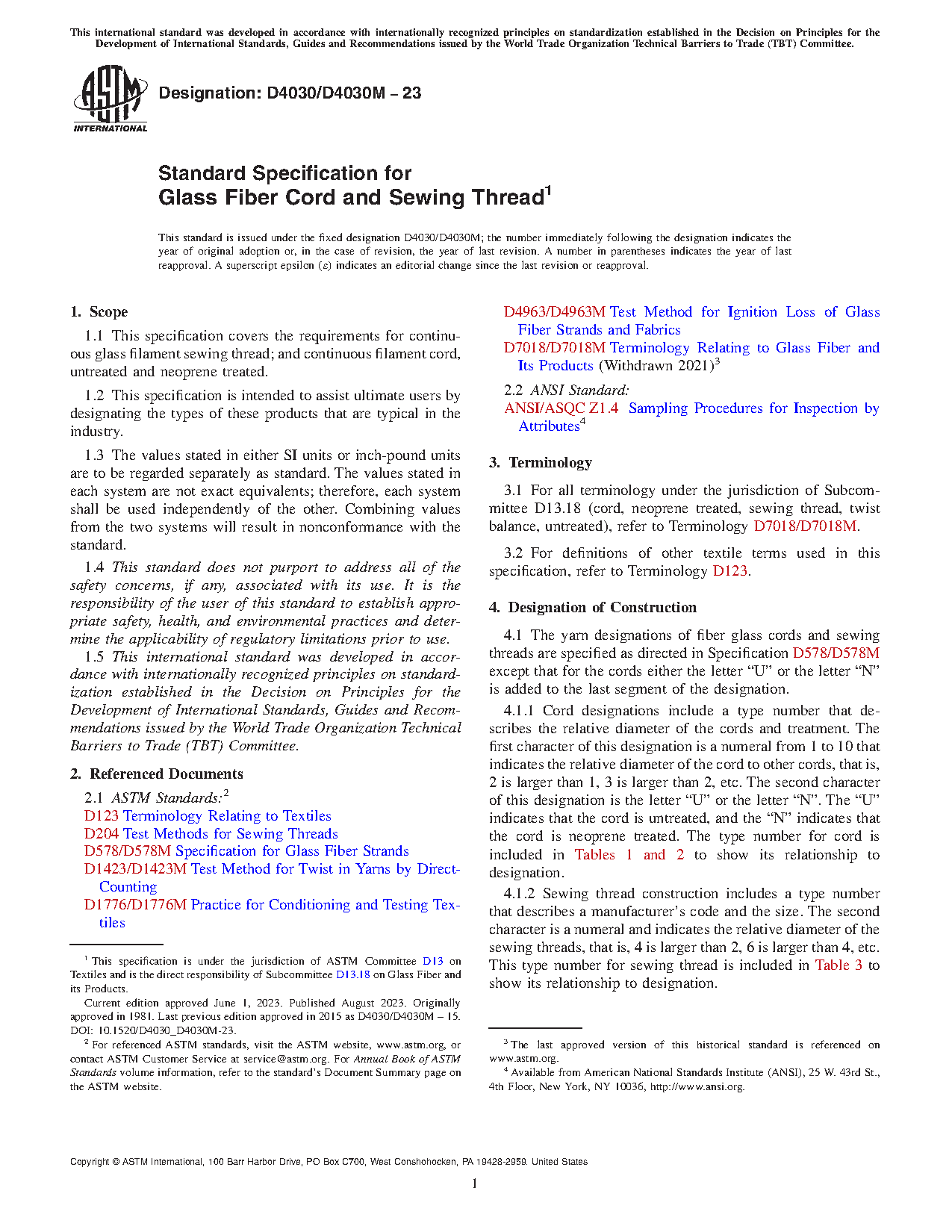 1.1 This specification covers the requirements for continuous glass filament sewing thread; and continuous filament cord, untreated and neoprene treated.
