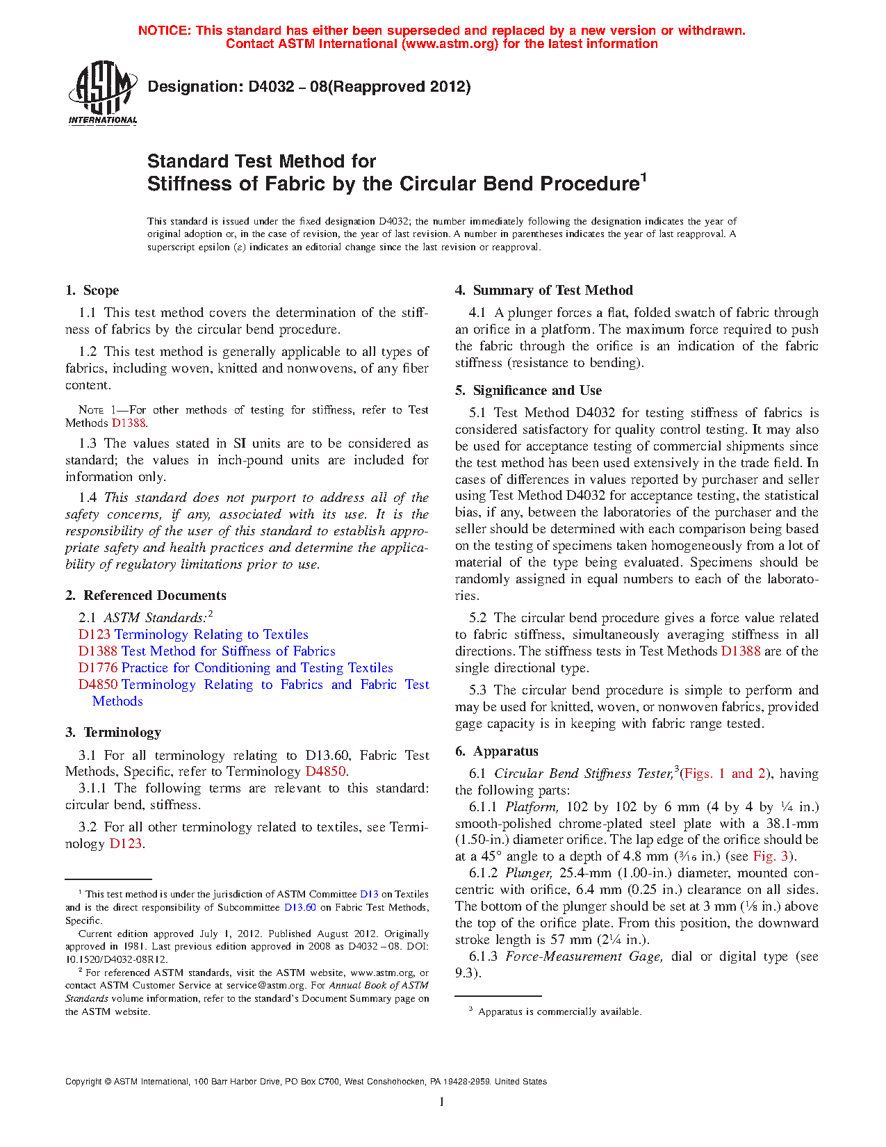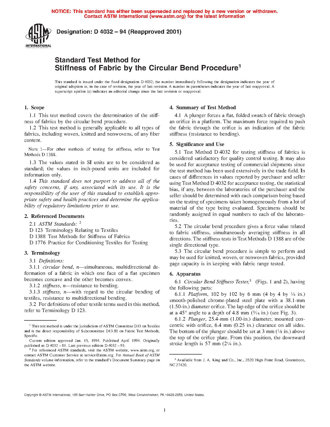 5.2 The circular bend procedure gives a force value related to fabric stiffness, simultaneously averaging stiffness in all directions. The stiffness tests in Test Methods D1388 are of the single directional type.