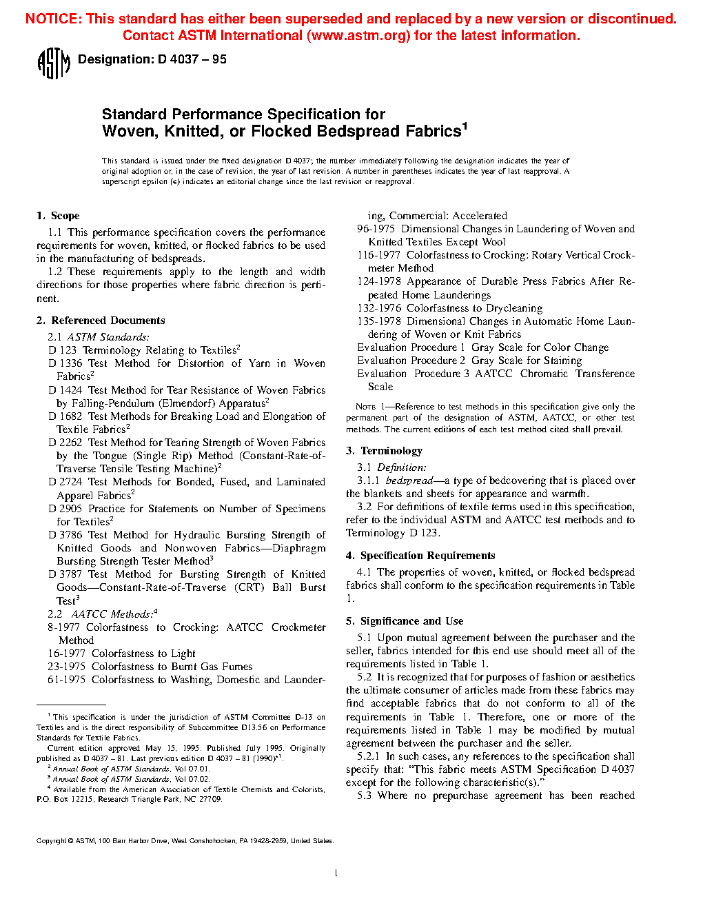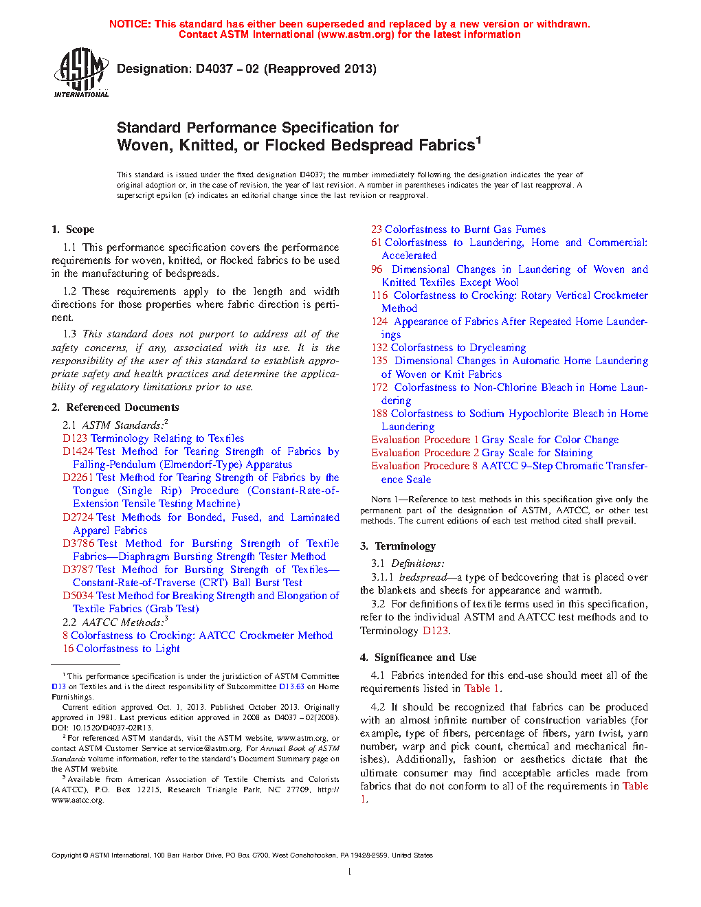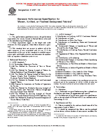 1.1 This performance specification covers the performance requirements for woven, knitted, or flocked fabrics to be used in the manufacturing of bedspreads.