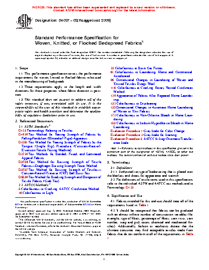 Standard Performance Specification for Woven, Knitted, or Flocked Bedspread Fabrics