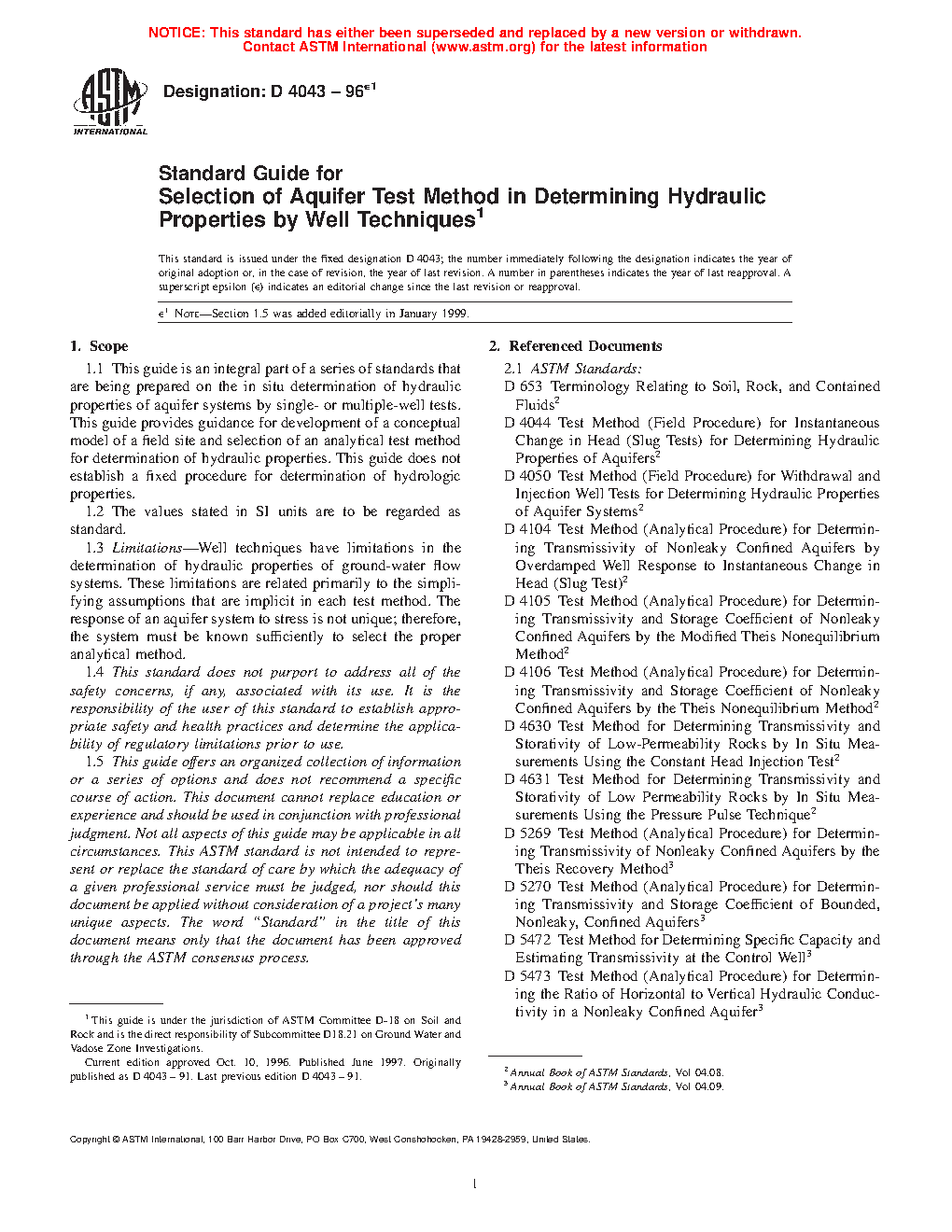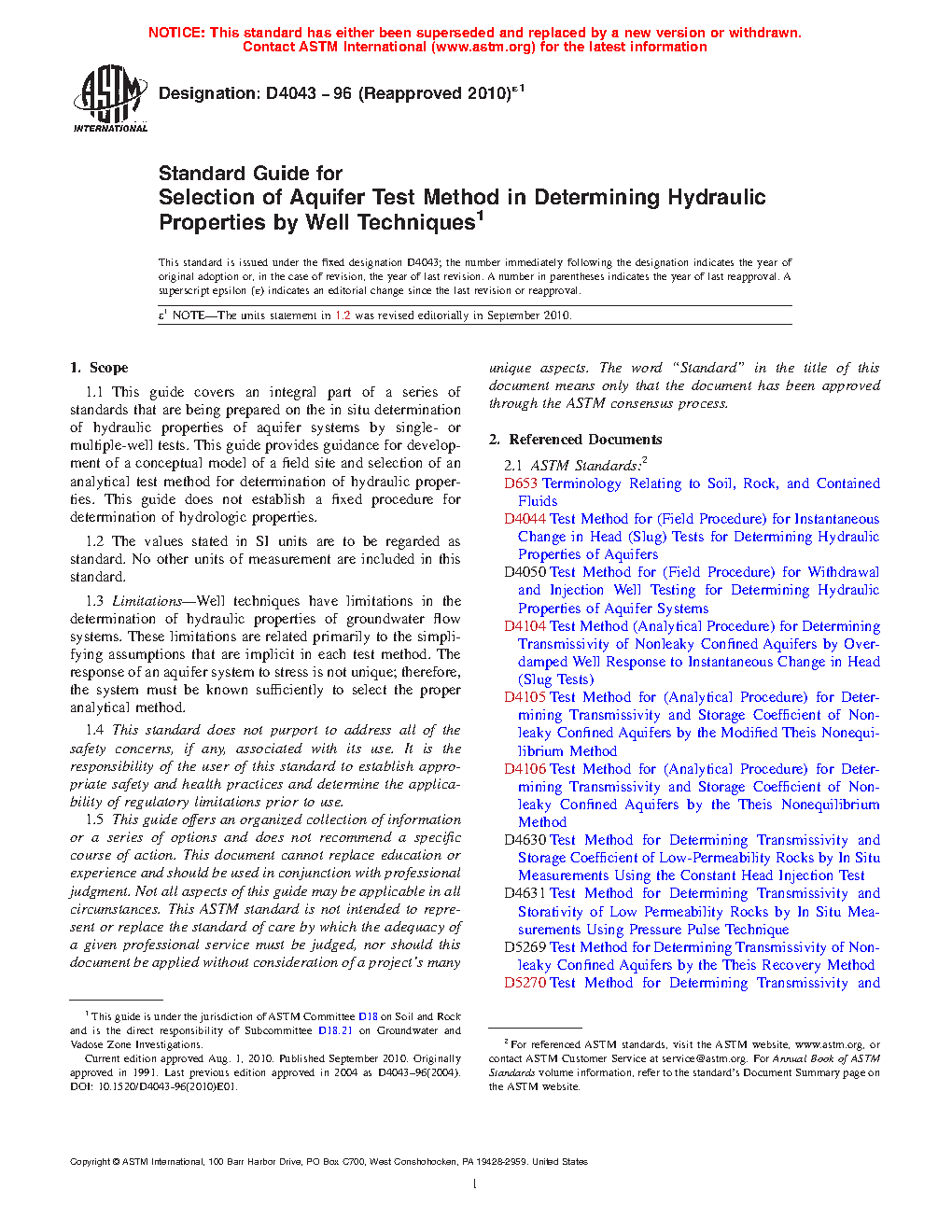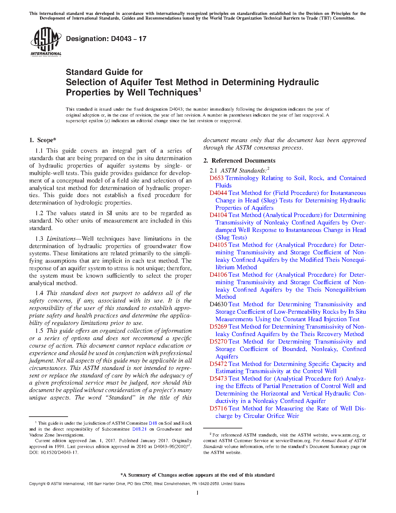 1.3 Limitations—Well techniques have limitations in the determination of hydraulic properties of groundwater flow systems. These limitations are related primarily to the simplifying assumptions that are implicit in each test method. The response of an aquifer system to stress is not unique; therefore, the system must be known sufficiently to select the proper analytical method.