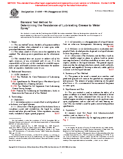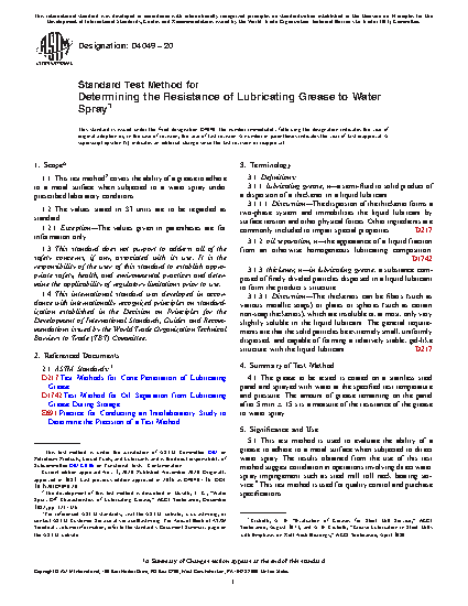 1.1 This test method2 covers the ability of a grease to adhere to a metal surface when subjected to a water spray under prescribed laboratory conditions.