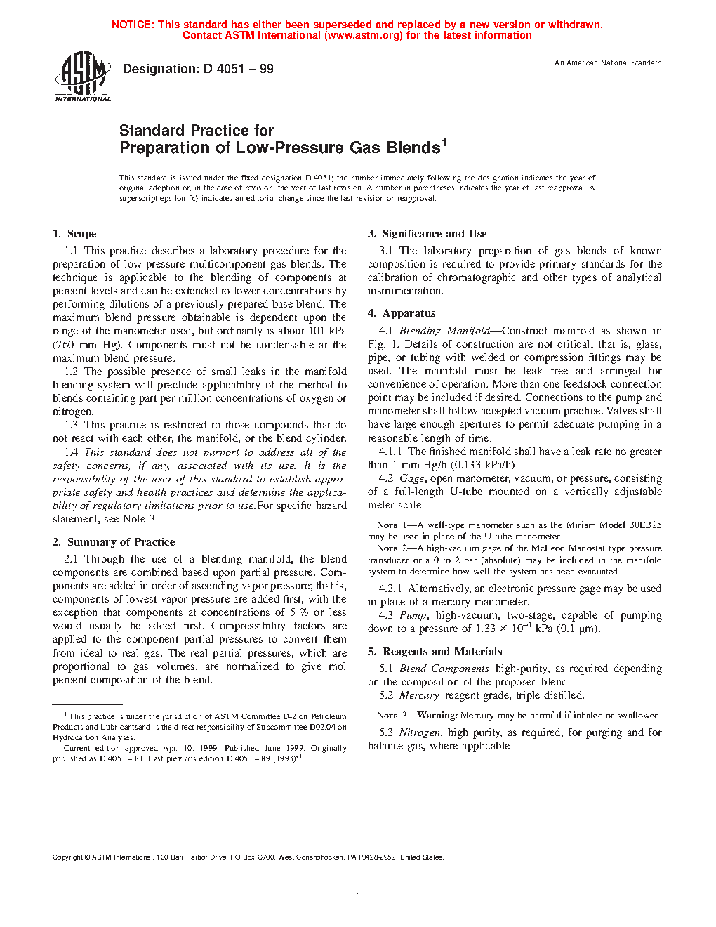 1.1 This practice covers a laboratory procedure for the preparation of low-pressure multicomponent gas blends. The technique is applicable to the blending of components at percent levels and can be extended to lower concentrations by performing dilutions of a previously prepared base blend. The maximum blend pressure obtainable is dependent upon the range of the manometer used, but ordinarily is about 101 kPa (760 mm Hg). Components must not be condensable at the maximum blend pressure.