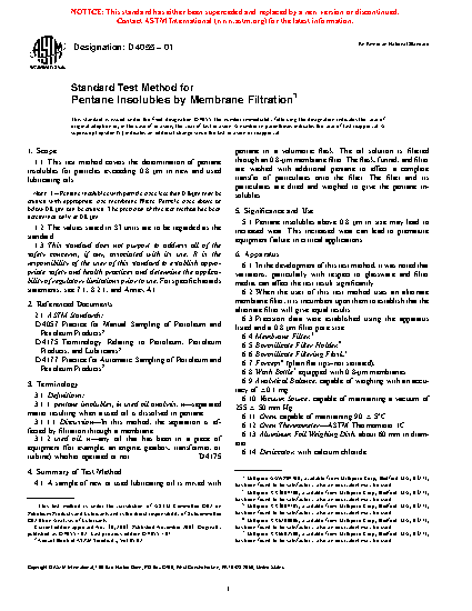 1.1 This test method covers the determination of pentane insolubles for particles exceeding 0.8 μm in new and used lubricating oils.