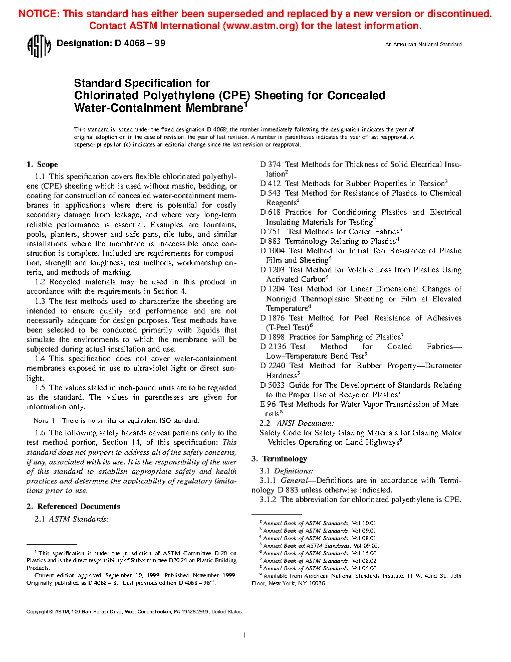 This specification covers flexible chlorinated polyethylene sheeting for use in concealed water-containment membranes in applications susceptible to costly secondary damage from leakage and which require very long term reliable performance, for example, fountains, pools, planters, shower and safe pans, and tile tubs. However, this specification does not cover water-containment membranes for use in applications involving exposure to ultraviolet light or direct sunlight. The sheeting shall be manufactured from a compound containing chlorinated polyethylene resin, with the resin being substantially amorphous and made from linear polyethylene. Recycled materials may be used, but must conform to the requirements specified, while the use of water-soluble materials shall be prohibited. Further, the sheeting shall be homogeneous, monolithic, and free of pinholes, particles of foreign matter, undispersed raw materials, blisters, coaters, pimples, pits, crazing, and thin spots, with the sheet edges being straight, parallel, and free of trim material. Tests for tensile strength, tensile stress at elongation, ultimate elongation, tear resistance, volatile loss, microorganism resistance, low-temperature flexibility, chemical resistance, hydrostatic pressure resistance, puncture resistance, bonded seam strength, thickness, pinholes, and shrinkage shall be performed and shall conform to the requirements specified.