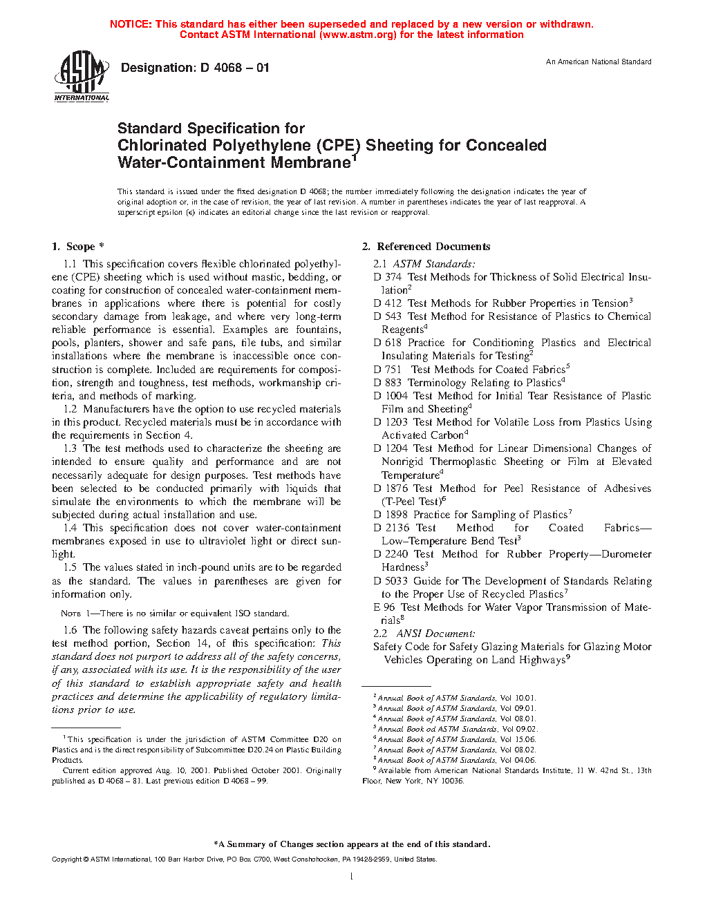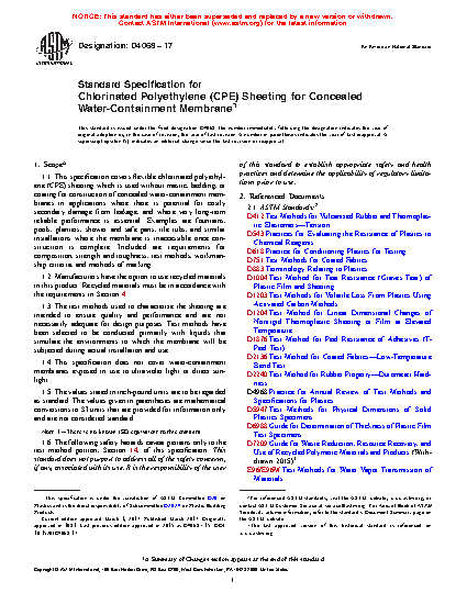 1.1 This specification covers flexible chlorinated polyethylene (CPE) sheeting which is used without mastic, bedding, or coating for construction of concealed water-containment membranes in applications where there is potential for costly secondary damage from leakage, and where very long-term reliable performance is essential. Examples are fountains, pools, planters, shower and safe pans, tile tubs, and similar installations where the membrane is inaccessible once construction is complete. Included are requirements for composition, strength and toughness, test methods, workmanship criteria, and methods of marking.